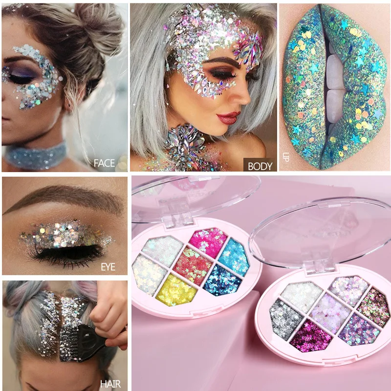 Палетка теней для век, 6 цветов, с большими блестками, водостойкая,...