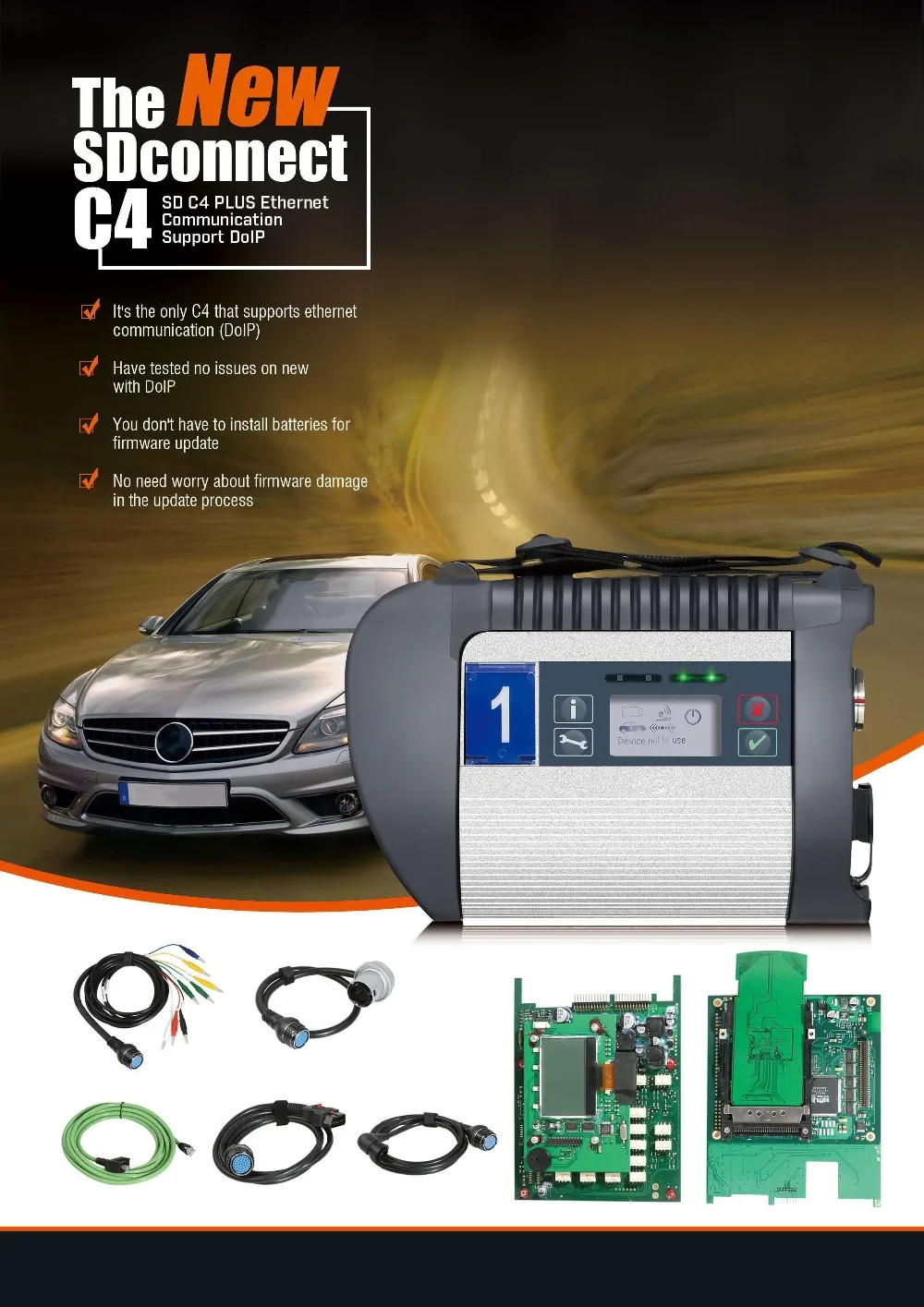 1. Новый SDconnect C4 (1:1 клон оригинала) может работать для DoIP. Это единственный C4, который поддерживает ethernet-связь (DoIP). Протестировано без проблем на новом mercedes с doip.