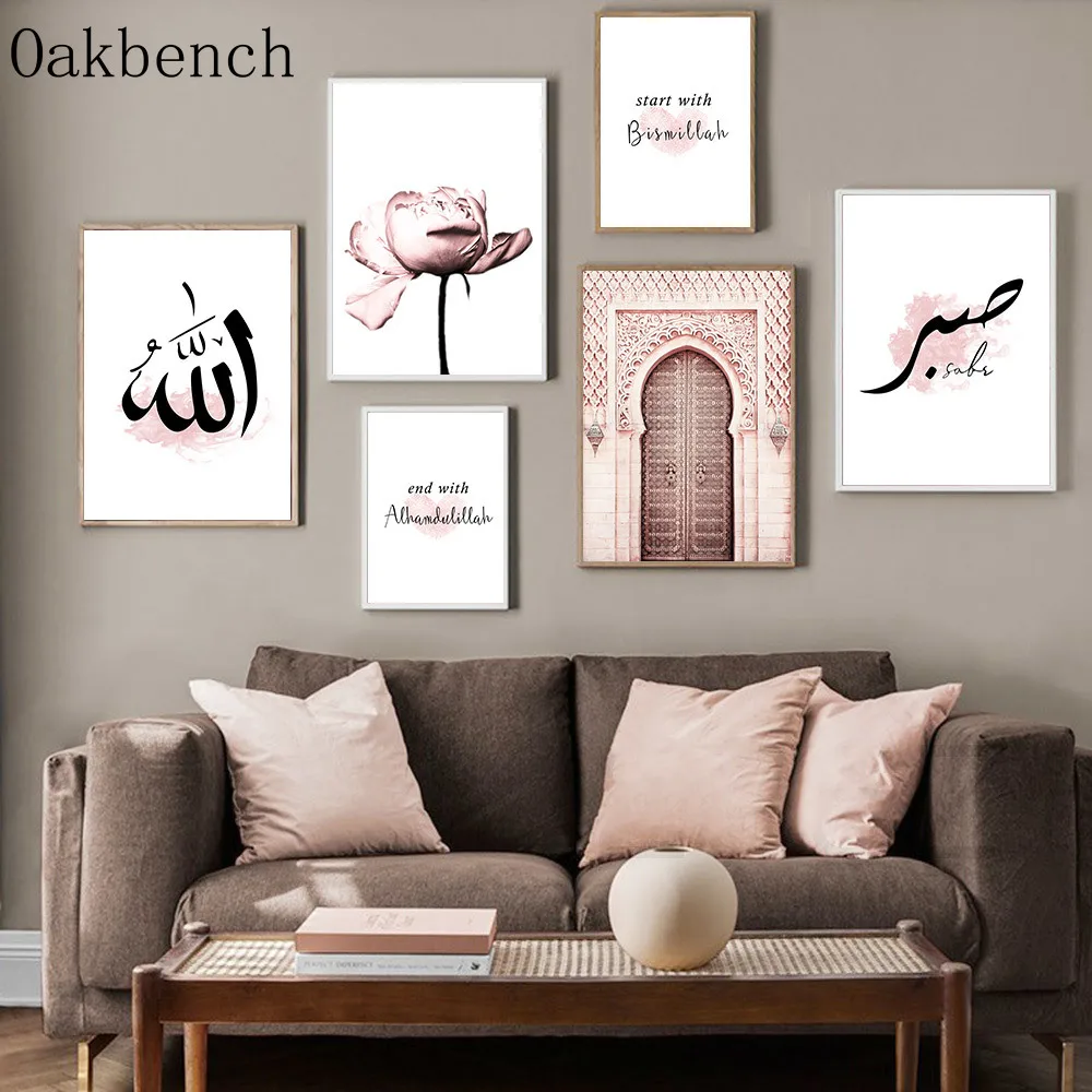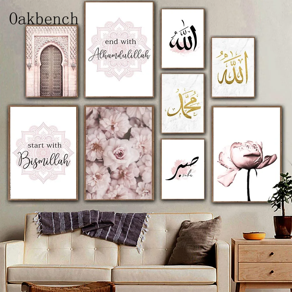 Мусульманская настенная Картина на холсте постеры для старых ворот розовый цветочный постер арабская каллиграфия печать скандинавские настенные картины Домашний декор