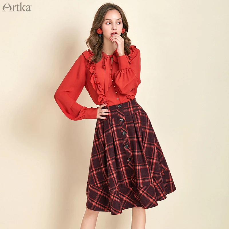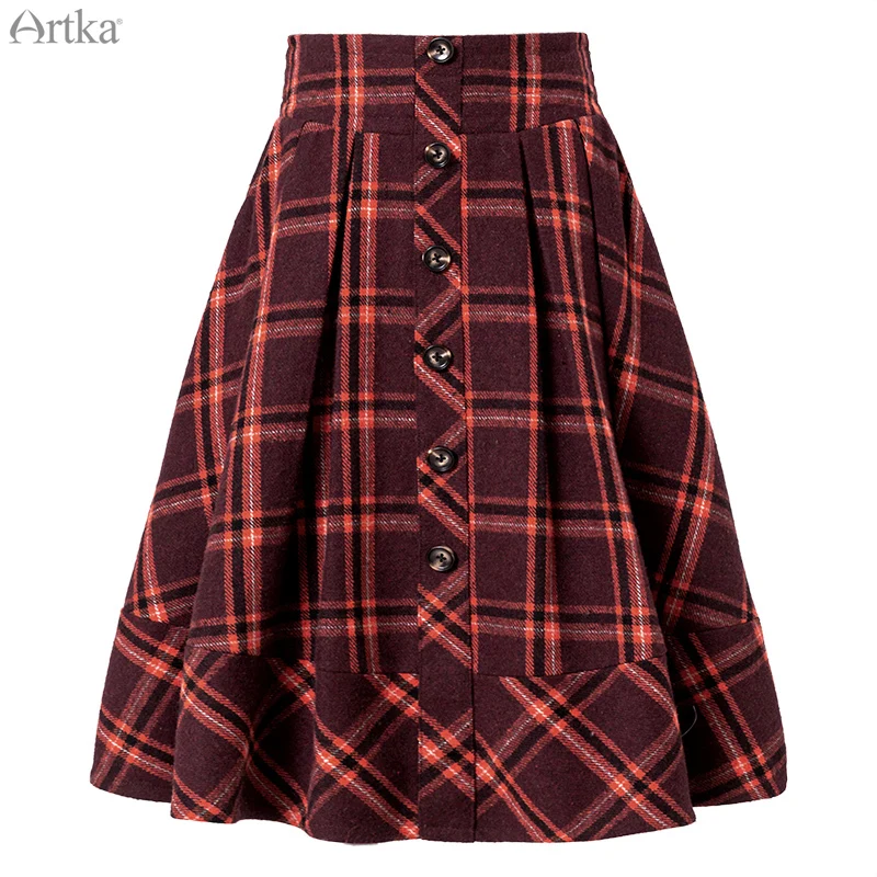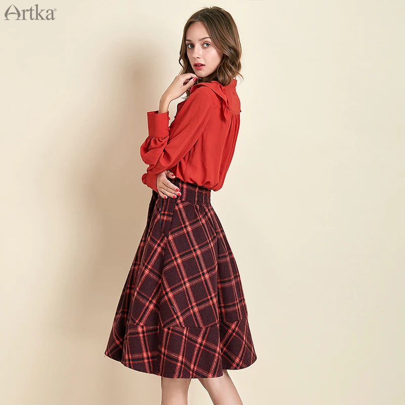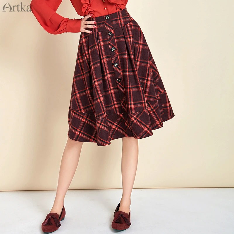 Женская шерстяная юбка ARTKA, винтажная клетчатая юбка с эластичным поясом, элегантная юбки с оборкой с карманами, QA10196D, весна-Зима 2020