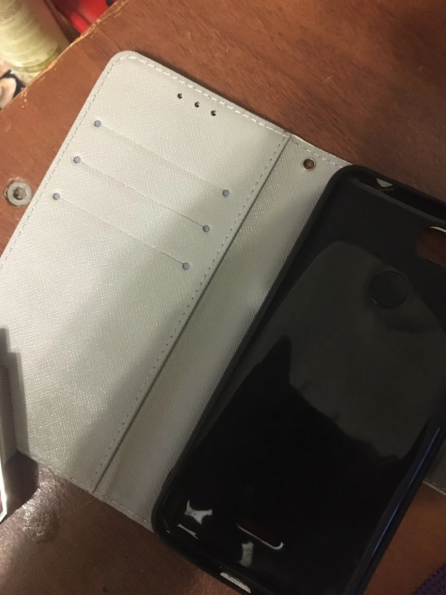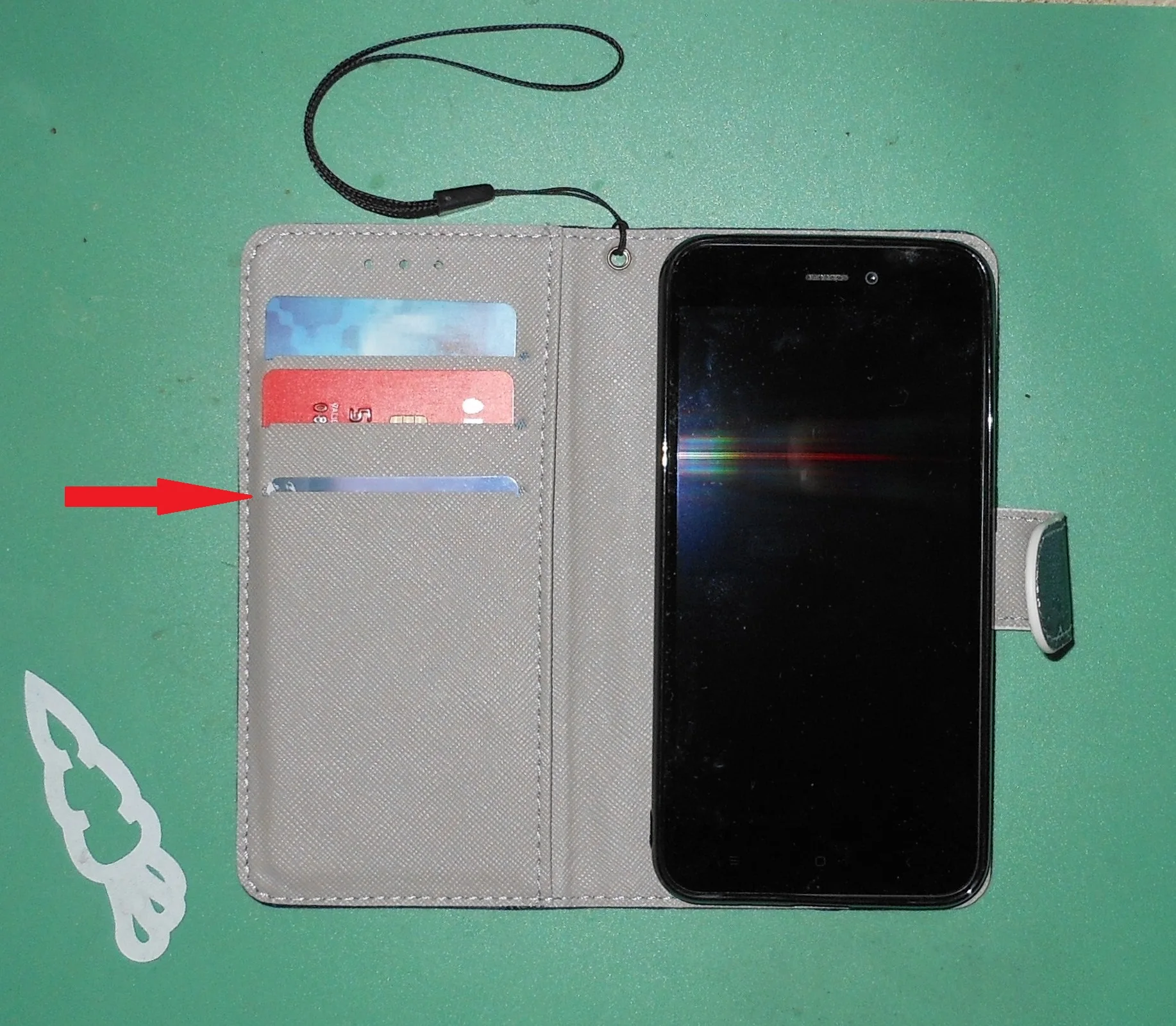 Чехол хороший, телефон лег идеально. Материал из которого изготовлен чехол естественно не кожа а обычная клеенка- продавец лукавит, указывая в названии товара слово "кожаный". Звезду за это снимать не стал, т.к. продавец после оплаты заказа выслал посылку практически на следующий день. Из придирок по чехлу: самый нижний карман сделан очень глубоким....карта в него проваливается и вытаскивать ее проблематично (отмечено стрелкой ), остальные два кармана сделаны нормально.