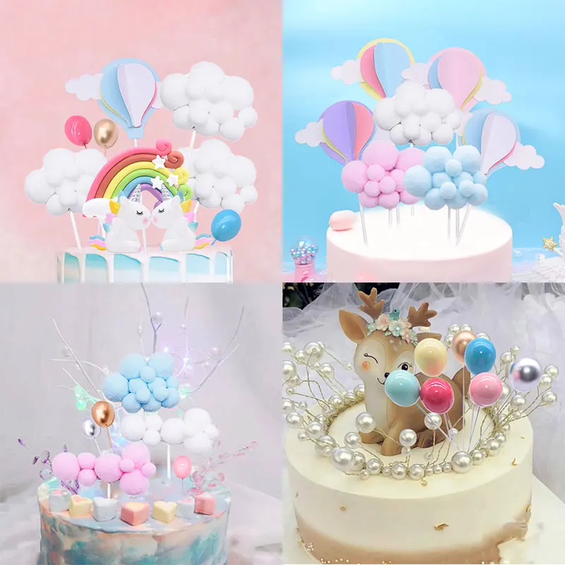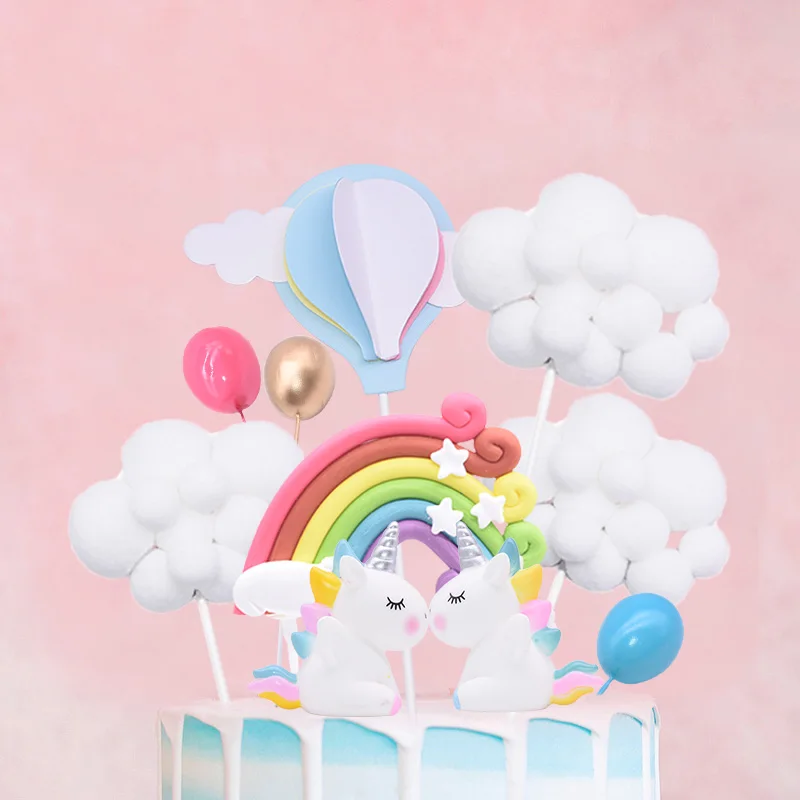 Количество: 1 шт./6 шт., как на картинкеМатериал: пластик, бумага, силикон, помпонФорма: облако, радуга, мини-шар, воздушный шар, единорогИспользование: детский торт на день рожденияУкрашения