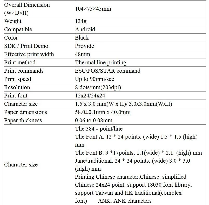 -Способ печати: термопечать-Интерфейс: разъем питания, мини USB-Скорость печати: 50-89,9 мм/сек.-Точка на линию: 384 точки на линию-Бумага Толщина: 0,05-0,10 мм-Бумага Ширина: 57 + / -0,5 мм-Ширина печати: 48 + / -0,5 мм-Диаметр рулонной бумаги: 25 мм-Жизненного цикла времени: 50 км (плотность печати под 12,5 процентов) / 100 миллионов импульсов-Тип штрих-кода: оптический патч-корд-A / E, не принимается; EAN - 13 / 8, CODE39 / 93 / 128, TIF, CODABAR; 2D: QR код, PDF417-Рабочая температура: -10 - 50 градусов по Цельсию-Внутренние символы: ASCII CH ( 8x16, 9x17, 9x24, 12x24 ); GB18030 ( 16x16, 24x24)-Команда печати: ESC / POS совместима с набором заказов-Подача бумаги: Легкая загрузка бумаги-Тест Black mark: Поддержка-Аккумулятор: литий-ионный аккумулятор 1500 мАч (в комплекте)