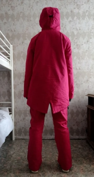 На рост 175см, 95/63/99 размер L - самое то! Длина штанов идеальна, посадка по талии подгоняется утяжкой. При утяжке основной пояс садится складками, что не очень комфортно (имхо). Теплоотводы с сеткой, по внешнему шву. Штаны БЕЗ утеплителя☝. Натягиваются на довольно широкие сноубботинки. Анорак просторный, с тонким синтепоновым утеплителем. В процессе носки хлыстики "собачек" на рукавах немного цепляются за сами молнии по бокам (надеюсь, понятно объяснила ). Теплоотводы сквозные, без сетки. Ткань манжет на ощуп с хлопком, что подразумевает намокаемость и пониженную износостойкость. Цвет не red wine☝, при дневном свете скорее малиновый. Все молнии на костюме прорезиненные. При катании не продувается, от талого снега намокает медленно. Куплен за 13400р. В инете в одном из РФских магазах этот же костюм стоил 24т.р. С учётом достоинств и изъянов, к приобретению на Али одобрен