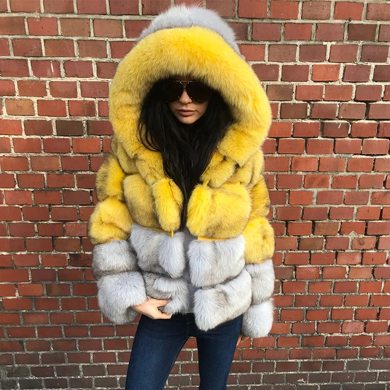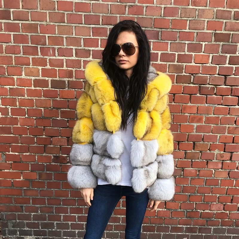 Модная Лоскутная искусственная с капюшоном, натуральная куртка из натурального синего лисьего меха для женщин, зимняя верхняя одежда, шубы