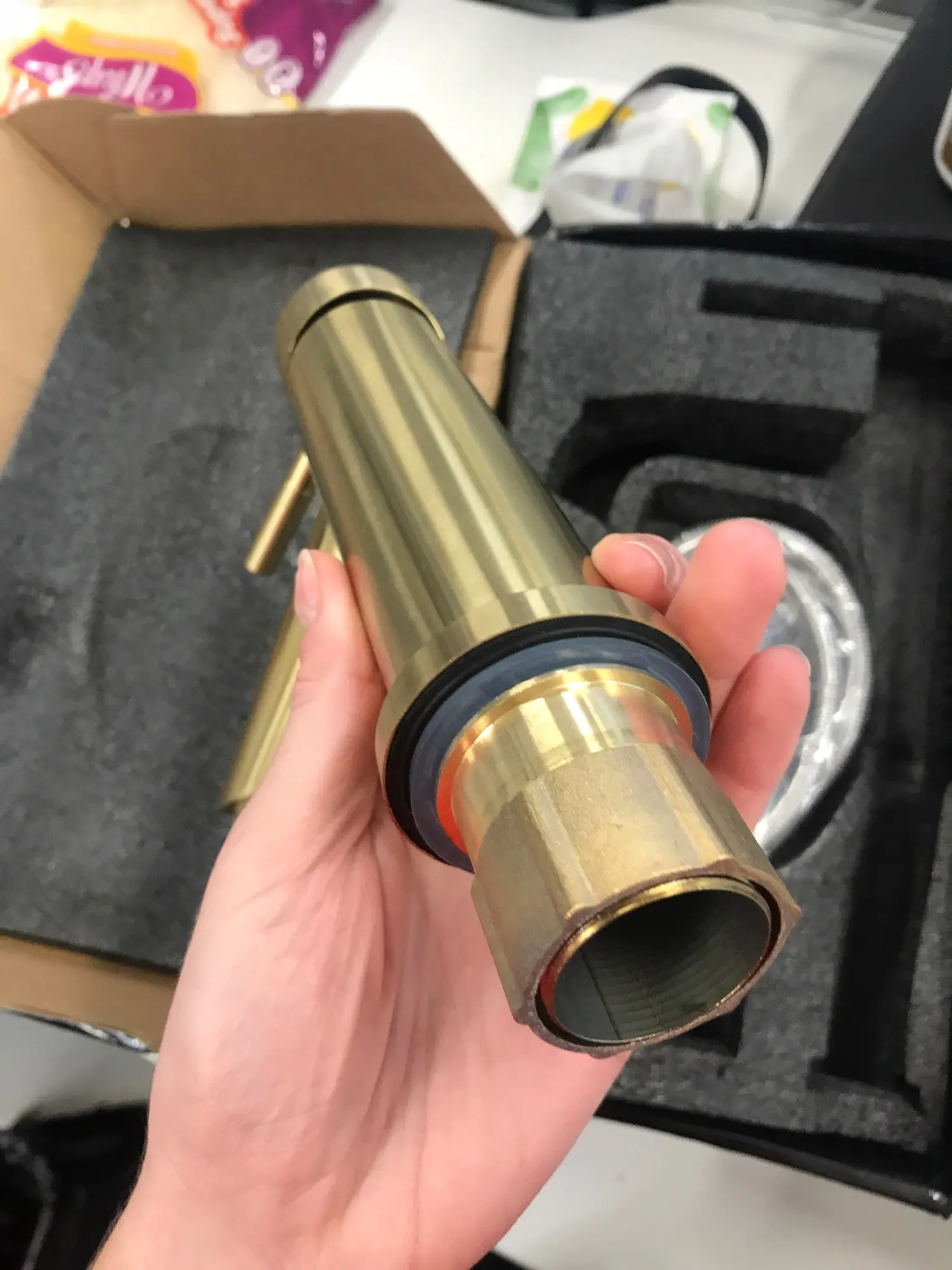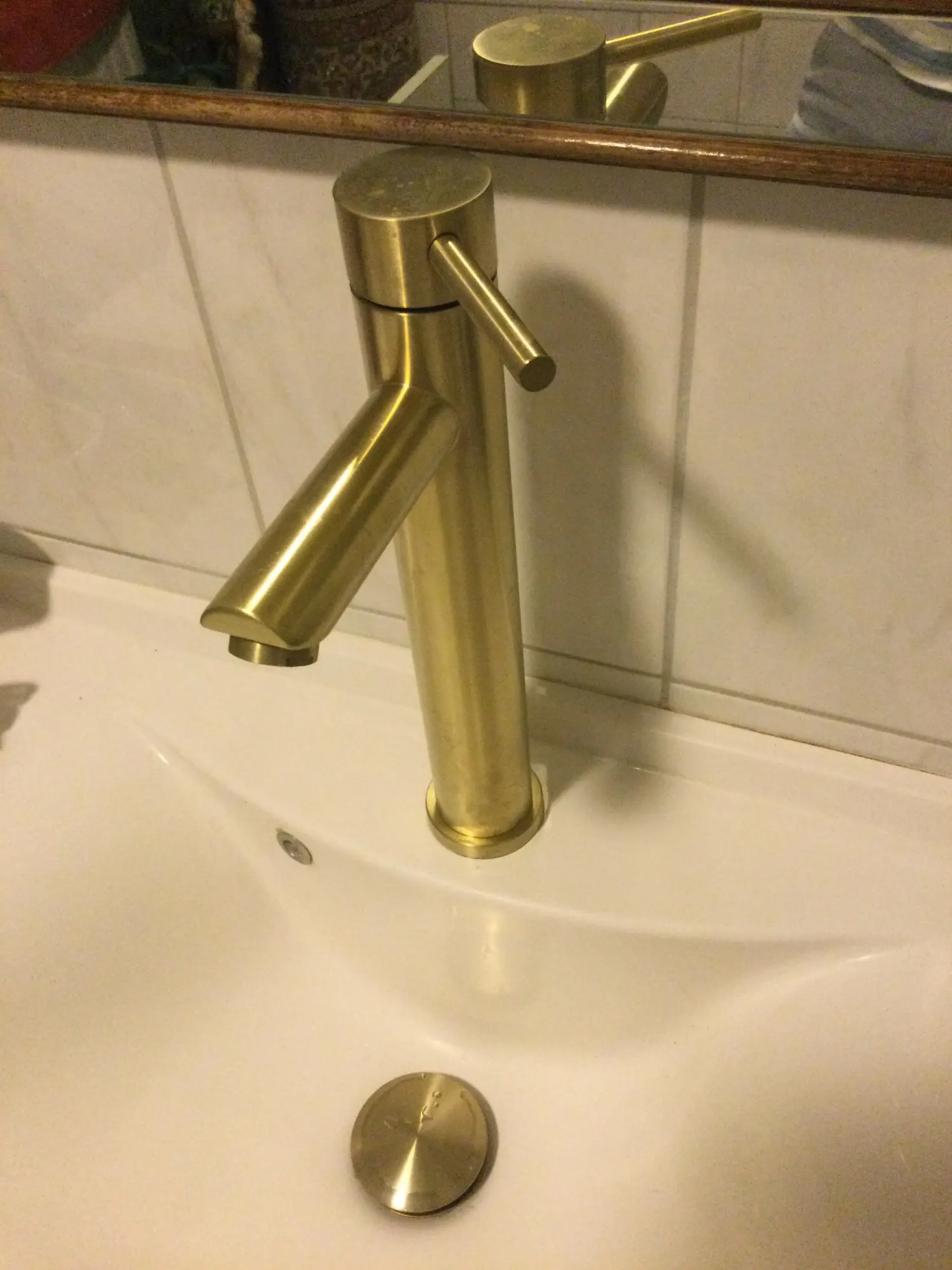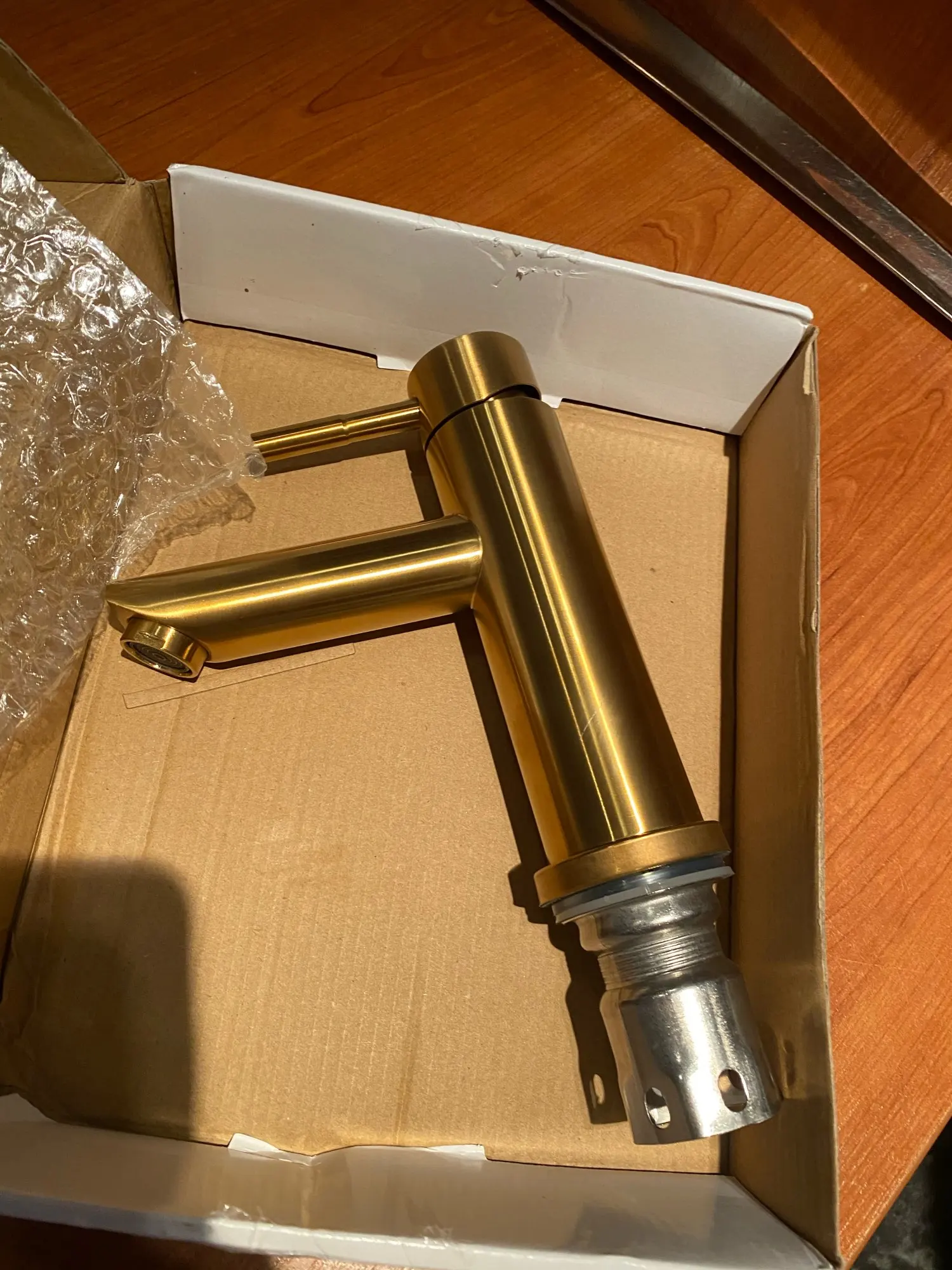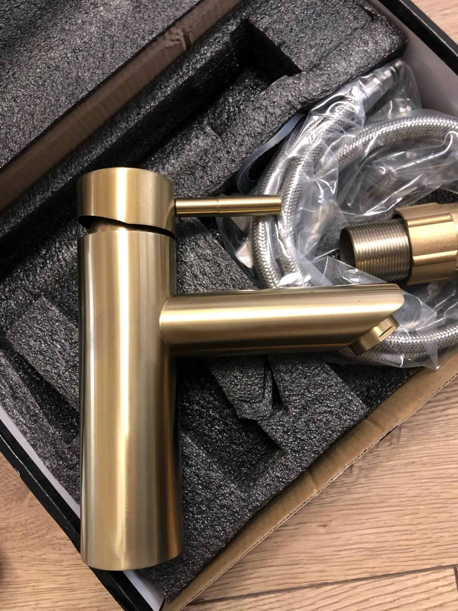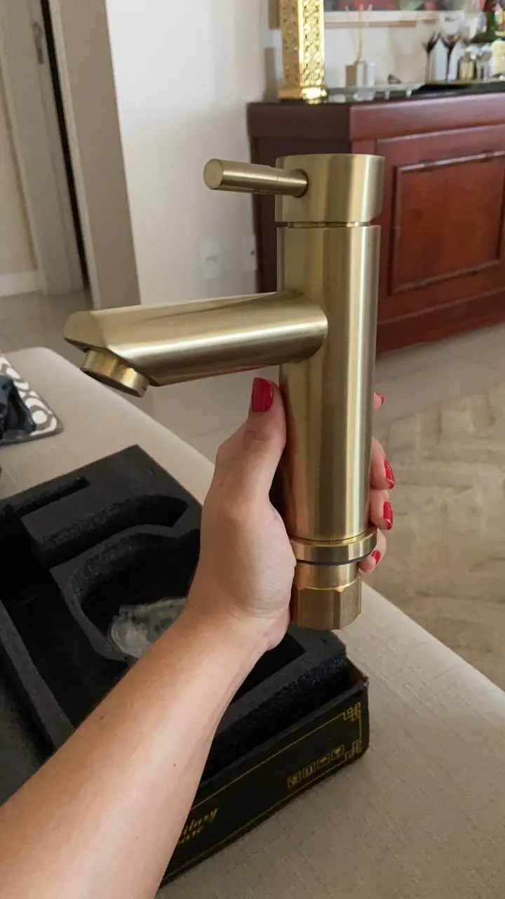 Тяжёлый,выглядит хорошо. Надеюсь золотому покрытию ничего не случиться при эксплуатации. Упаковка коробка ооочень хлипкая,вся разорвана. Из претензий к крану, на основании резинка как прокладка ( не снимается) очень жёсткая и вся кривая. Драная. Я не пойму как она будет при установке,кран косит. Посмотрим.
