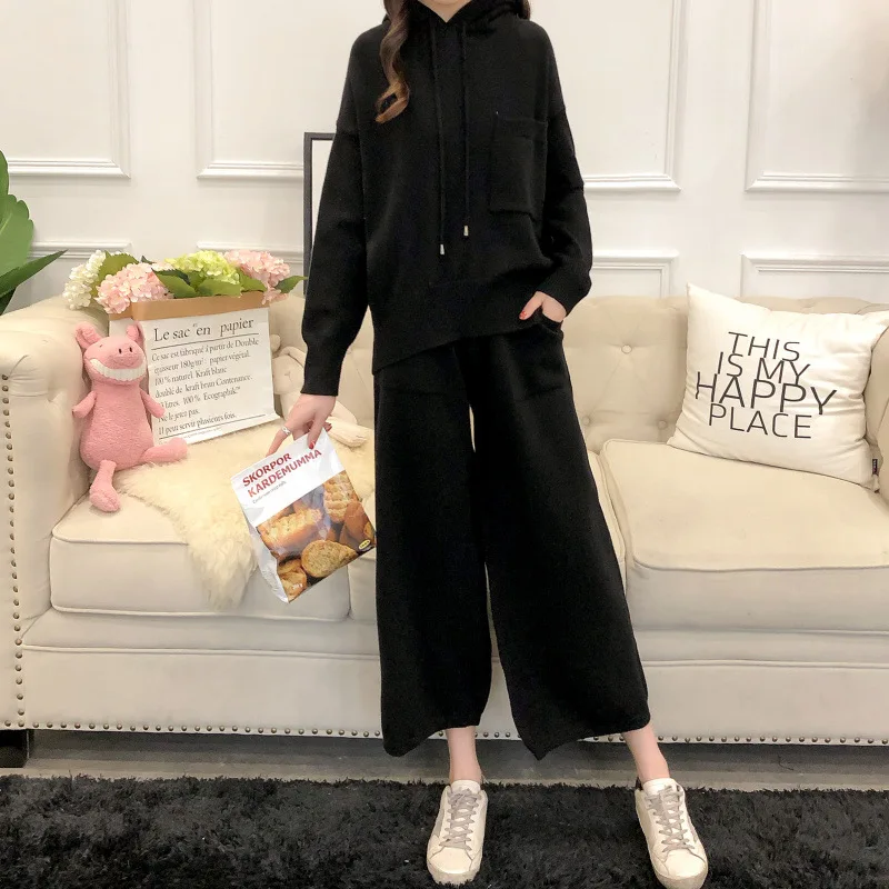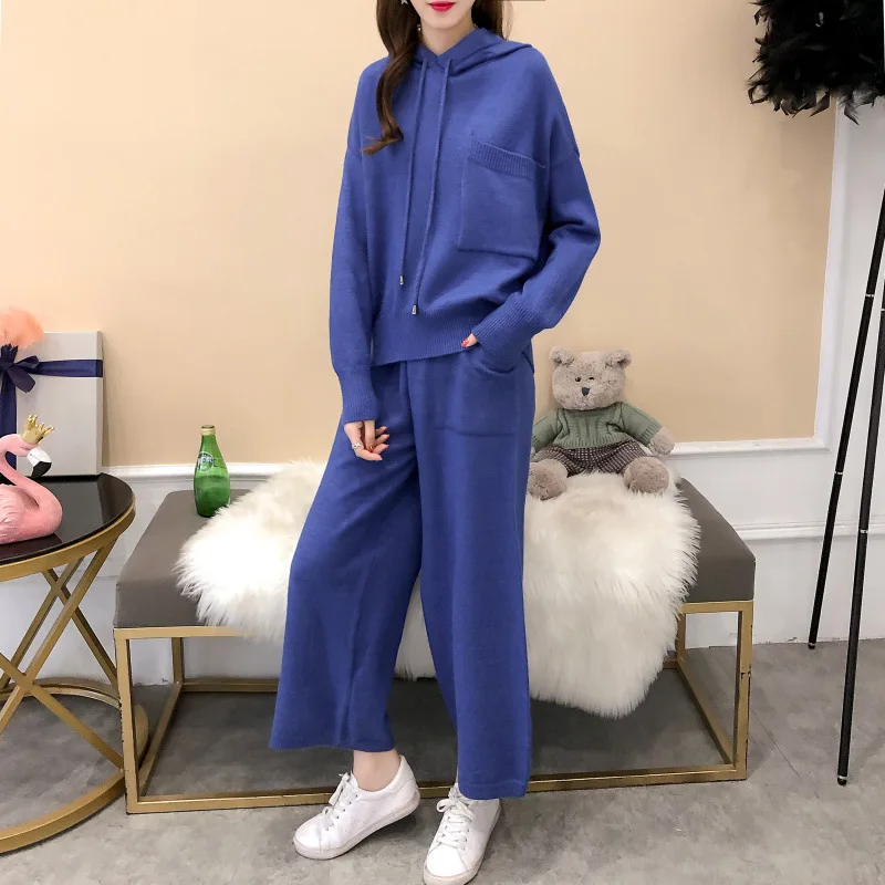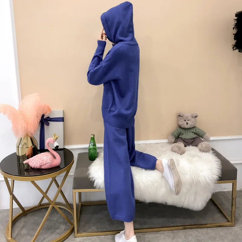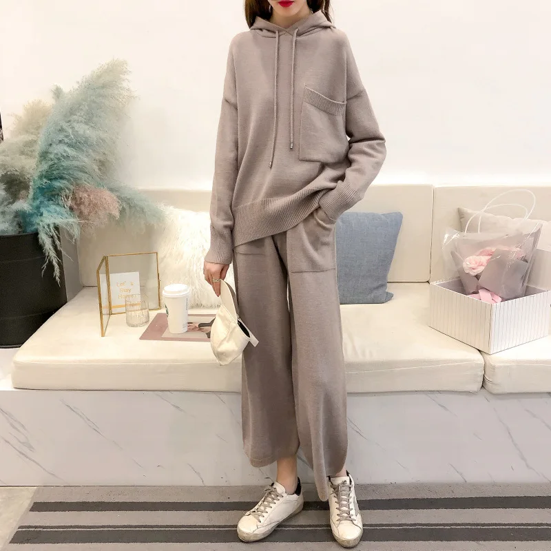 Женский трикотажный комплект из 2 предметов, Повседневный свитер с капюшоном и свободные штаны, Осень-зима, OS242