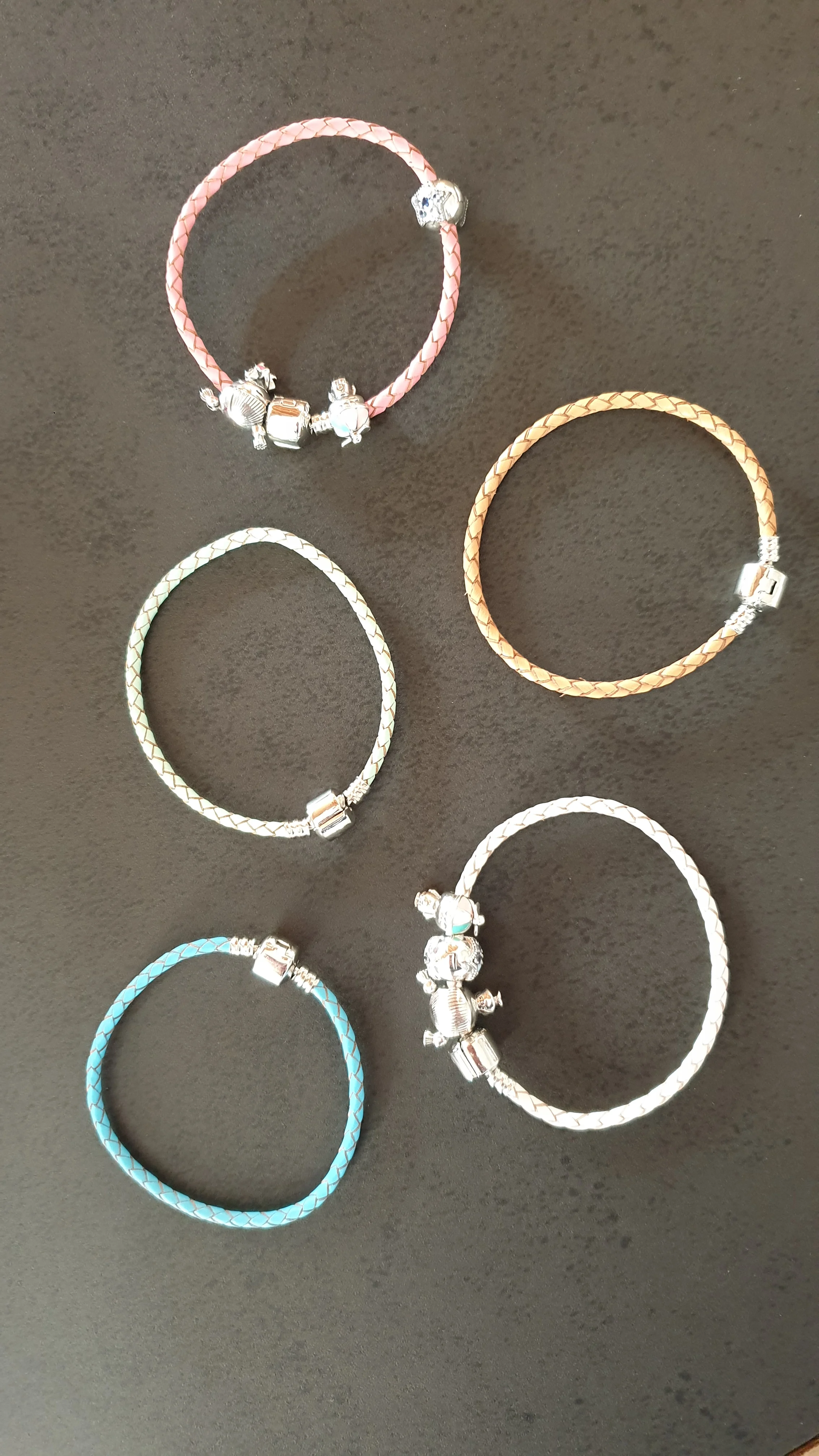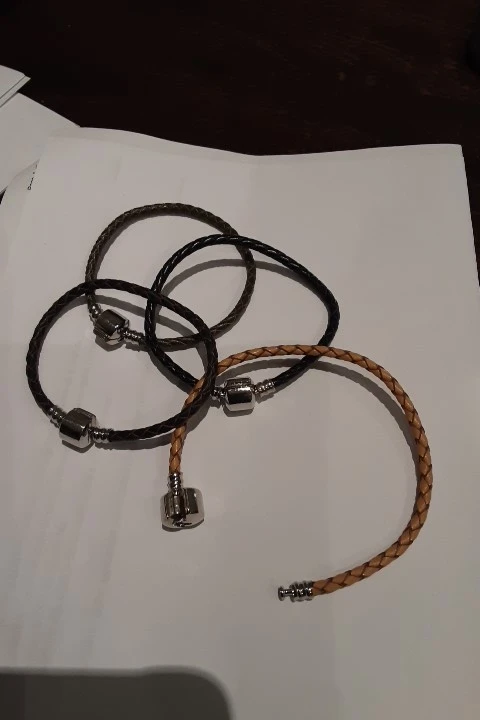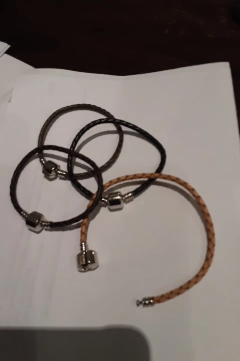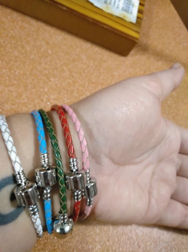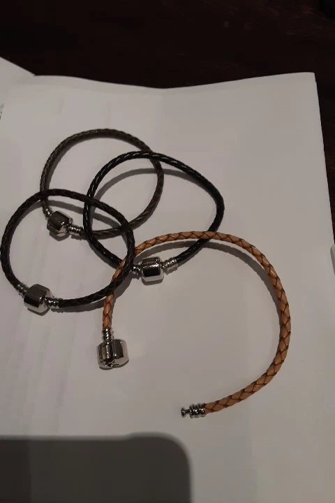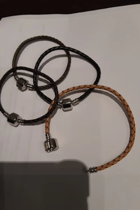 Браслеты очень крутые, думаю, что кожа. Застегиваются крепко, так что шармы выдержат. У меня браслеты на 17 и 18 см. Сидят красиво, нисколько не мешают. Очень давно искала, что то такое и простое и стильное одновременно. Можно носить с шармами, можно без, и так и так смотрятся красиво! Перед покупкой замерьте руку, если будете носить шармы на браслетах берите на 1 см больше.