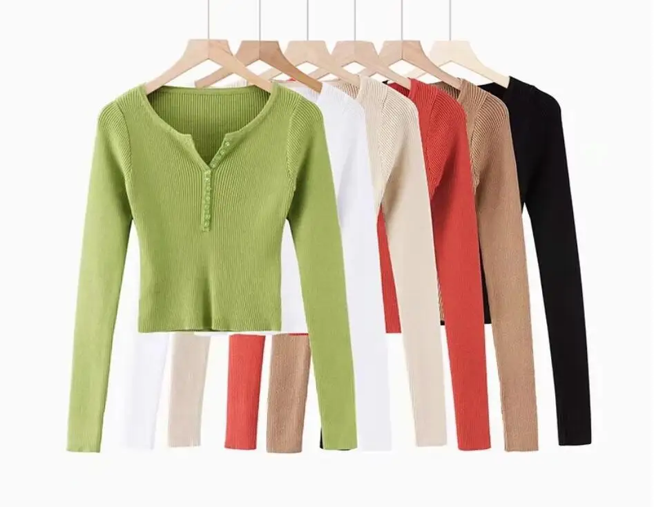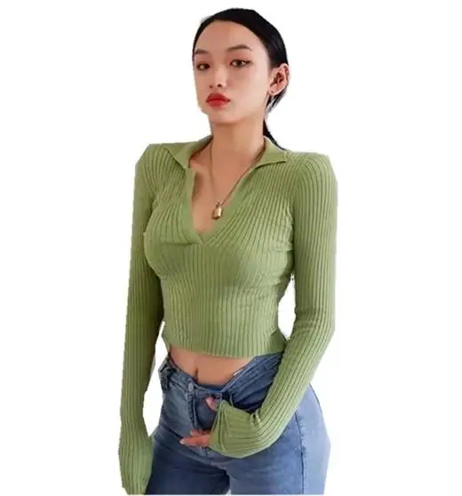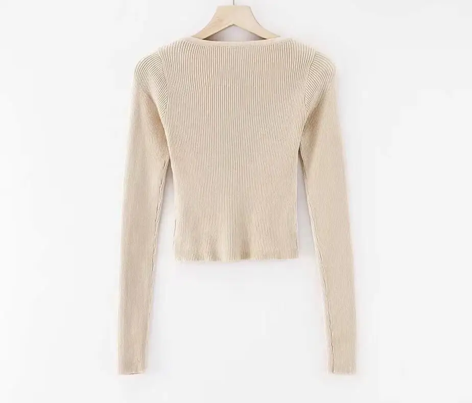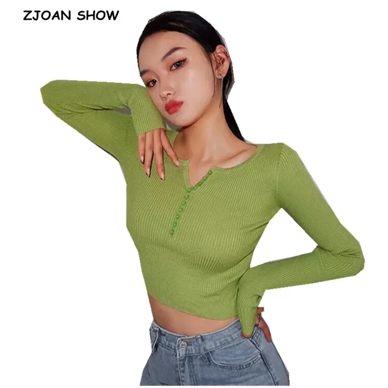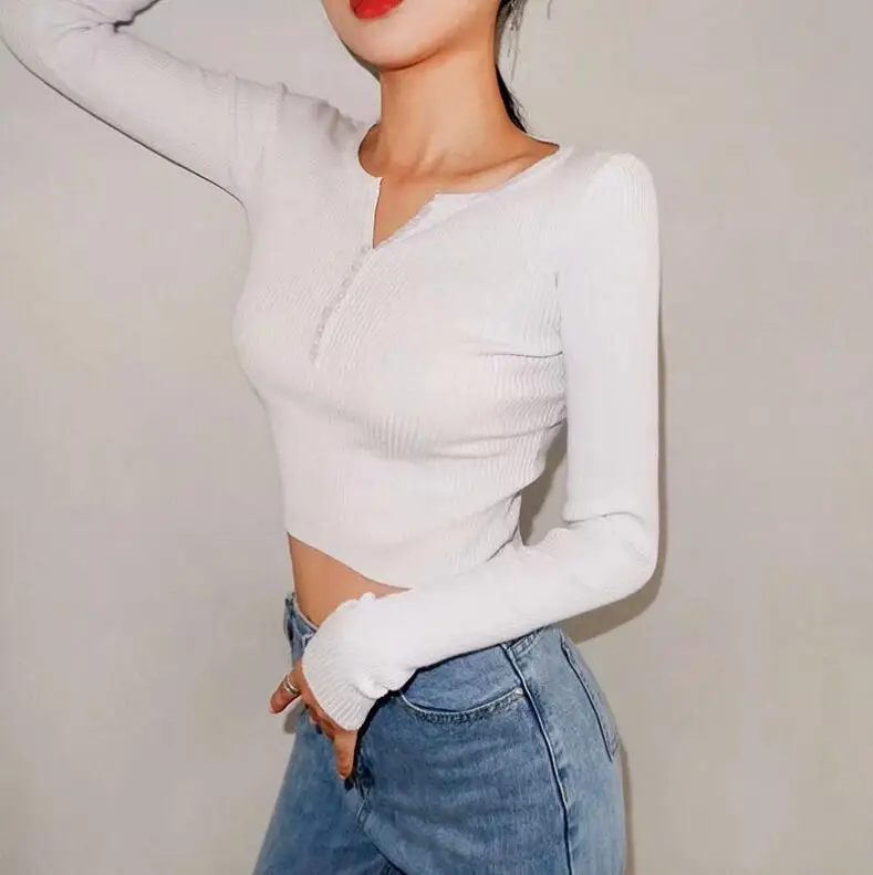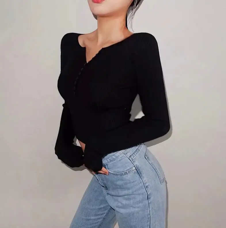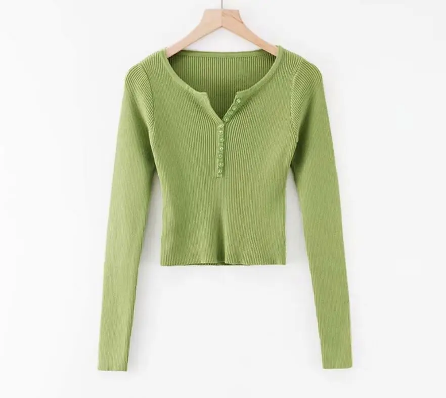 Женский вязаный свитер 6 CLR 2019 в полоску с пуговицами и V-образным вырезом, винтажный короткий пуловер с открытым пупком, трикотажная одежда, джемпер с длинным рукавом, топы