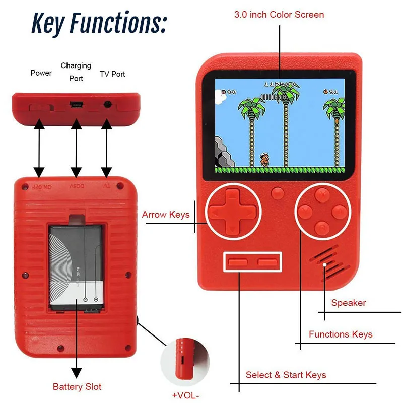1, встроенный 800 ретро FC игры, идеальный компаньон для продвижения наших детей зрительно-ручную координацию способностей, он также может доставить вас в детство.2, игровой автомат 3 дюймов Цвет Экран, 150g легкий, может быть с вами в кармане, сумке и т. Д. Он идеально подходит для путешествий или где бы вы ни находились. На экране есть защитная пленка, вы можете оторвать ее, когда получите игровую консоль.3, литиевая аккумуляторная батарея большой емкости 800 мАч, наша игровая машина с большой емкостью 800 мАч, непрерывное использование в течение 6 + часов.4. Поддерживает выход экрана телевизора, вы можете подключить игровые консоли к телевизору и наслаждаться большим экраном по телевизору.