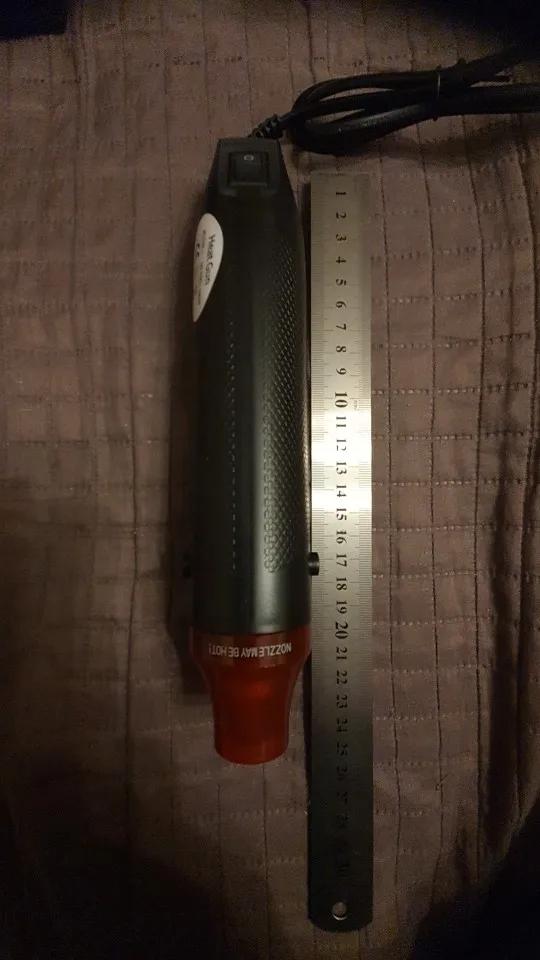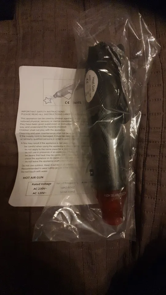 Доставка около 20 дней, юг Кемеровской области. Упаковка пакет пупырчатый и собственная коробка. Устройство исправно, есть только тумблер "вкл/выкл". Не рассчитывайте, что вы сможете паять компоненты РЭА. Пойдет для термоусадки, термонаклеек на одежду.... Длительность непрерывной работы около 10минут. Полное соответствие описанию!!
