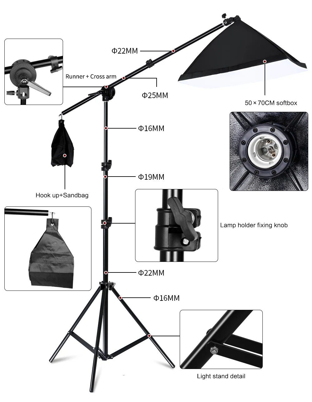 1x50 см * 70 см держатель одной лампы Мягкая коробка1 x Светодиодная лампа 1 x стрела (доставка из Китая, Российской Федерации длина 53 см-133 см.Доставка из Германии, Испании, Израиля Длина 75-135 см)1 x рукоятка1 х песочницаСветильник-подставка 1x200 см