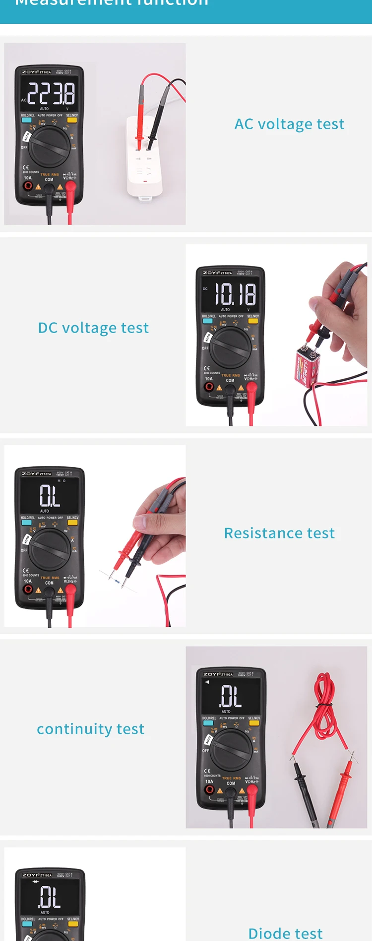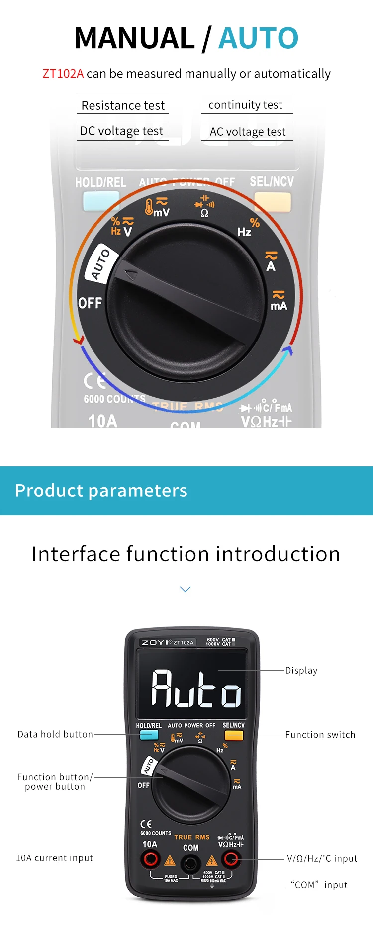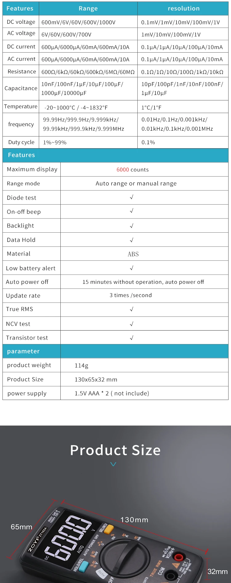 Цифровой мультиметр ZT102A 6000 отсчетов Авто 113D Подсветка AC DC Вольтметр Транзистор Тестер Частота Диод Температура