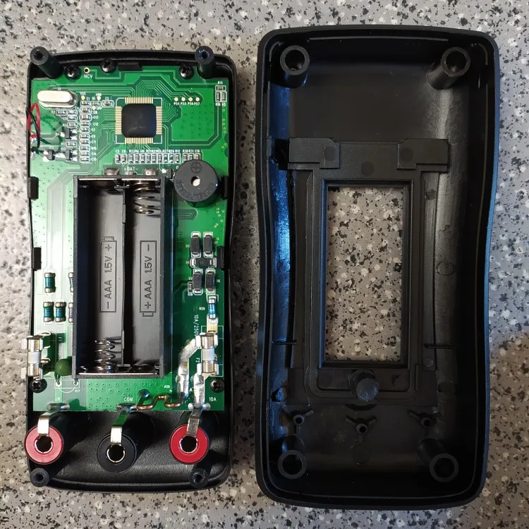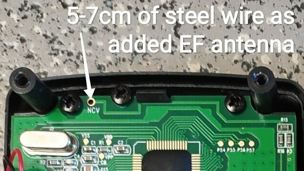 Продавец красавец, без всяких обещаний просто добавляет классный чехол в подарок. Мутьтиметр не большой, но очень удобный, продуманный и привычный. Сразу включается на режим Auto, но при необходимости легко перейти на ручной режим. Точность хорошая, в пределах заявленной. Плата внутри типовая, от бренда не зависит. Из минусов - нужно питание не менее 2.6V, иначе дисплей не виден. Как выход - поставить литий-ионный аккумуляторы на 1.5V, что накладно, так как это ещё пол стоимости мультиметра. Потребление 20-30mA. Второй минус - это плохая чувствительность в NCV режиме, при определении EF поля. Лечится легко - наращиванием антены 5-7см кусочком стального провода в изоляции, которым скручены щупы (место подсоединения указано стрелкой), после чего проводка определяется с растояния 10-15см. Так все мультиметры можно улучшить.