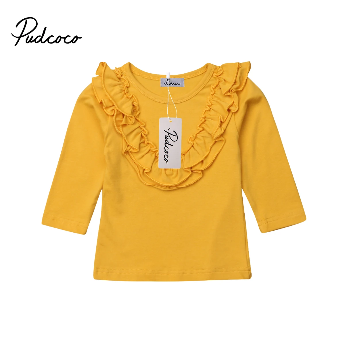 Лидер продаж, хлопковая футболка с длинными рукавами для маленьких девочек От 0 до 5 лет одежда для детей весенне-осенние однотонные футболки с оборками, повседневные топы