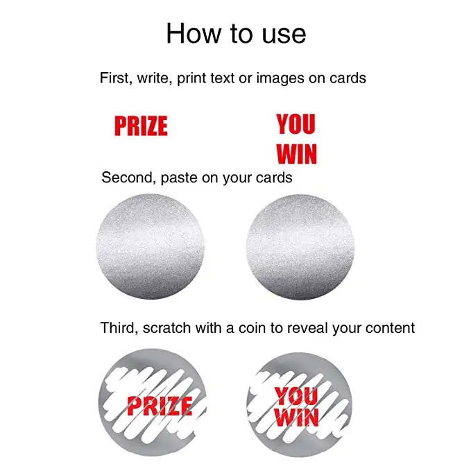 Посылка: 300 штук Сотрите наклейки; Размеры измерения: 1 дюйм/2,5 см; Форма: Круглый; Цвет: серебро, золотоХарактеристика: очень просто и интересно делать свои собственные царапины с карт, просто наклеить и поцарапать ихТеплое напоминание: между слоем царапины и бумагой есть пленка, поэтому ваше содержимое защищеноИспользование: Наклейте круглый клейкий ярлык поверх Вашего содержимого, как обычная наклейка, затем поцарапайте монеткой, чтобы показать ваше содержаниеПодходит для: поделки своими руками, Создание собственных билетов на царапины и игральных карт во время свадеб, свадебных ливней, детских ливней и многого другого