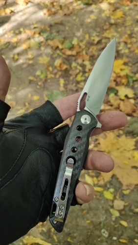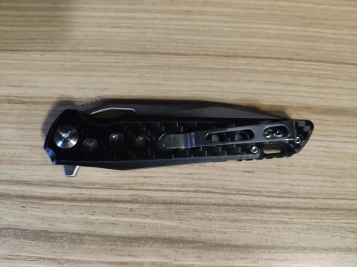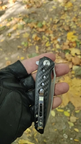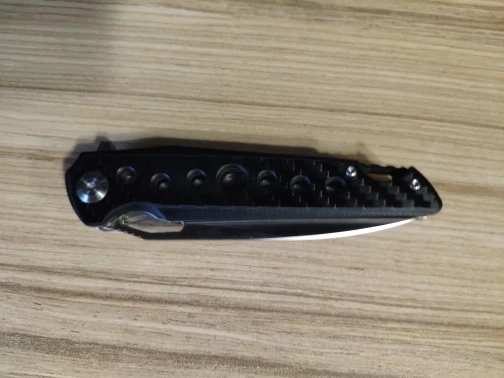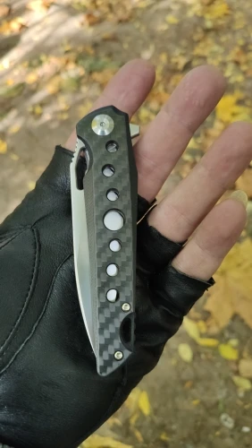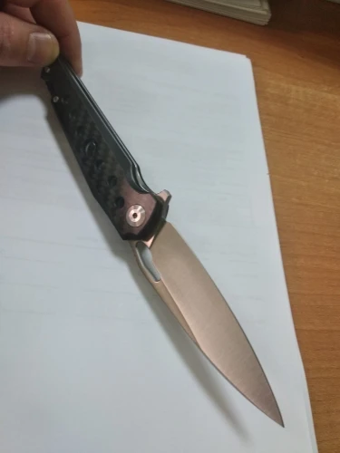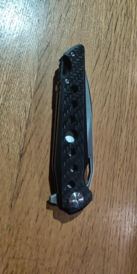 Ручка не из карбона, это просто наклейка. Имеются небольшие люфты. На лезвии есть «рыжик», что за сталь такая?)) Не рекомендую не берите.