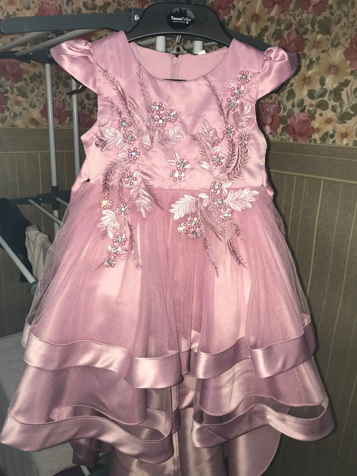 Сшито платье прекрасно. Крой отличный. Фурнитура пришита крепко (первым делом платье постирала, все бусинки и стразы на месте). Мне не совсем понравилась ткань верхней части платья. Такое ощущение, что в будущем она будет в зацепках. Также платье однозначно требует подъюбника. Иначе пышности не будет.