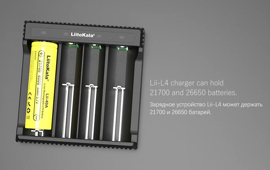 Бренд: LiitoKalaМодель: Lii-L4Вход: 5 В/2 АВыход: 4,2 V / 500mA * 4Подходит батарея: 18650 26650 21700 20700 20650 18500 18490 18350 и т. д.Заказы включают: Lii-L4 * 1USB кабель * 1Примечание: Не подходит для 1,2 в никель-металл-гидридного/компакт-дисков и Li-FePO4 3,2 V Батарея.