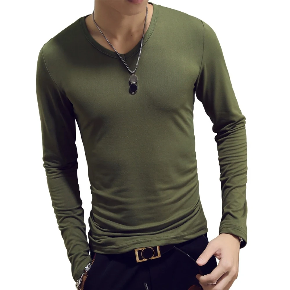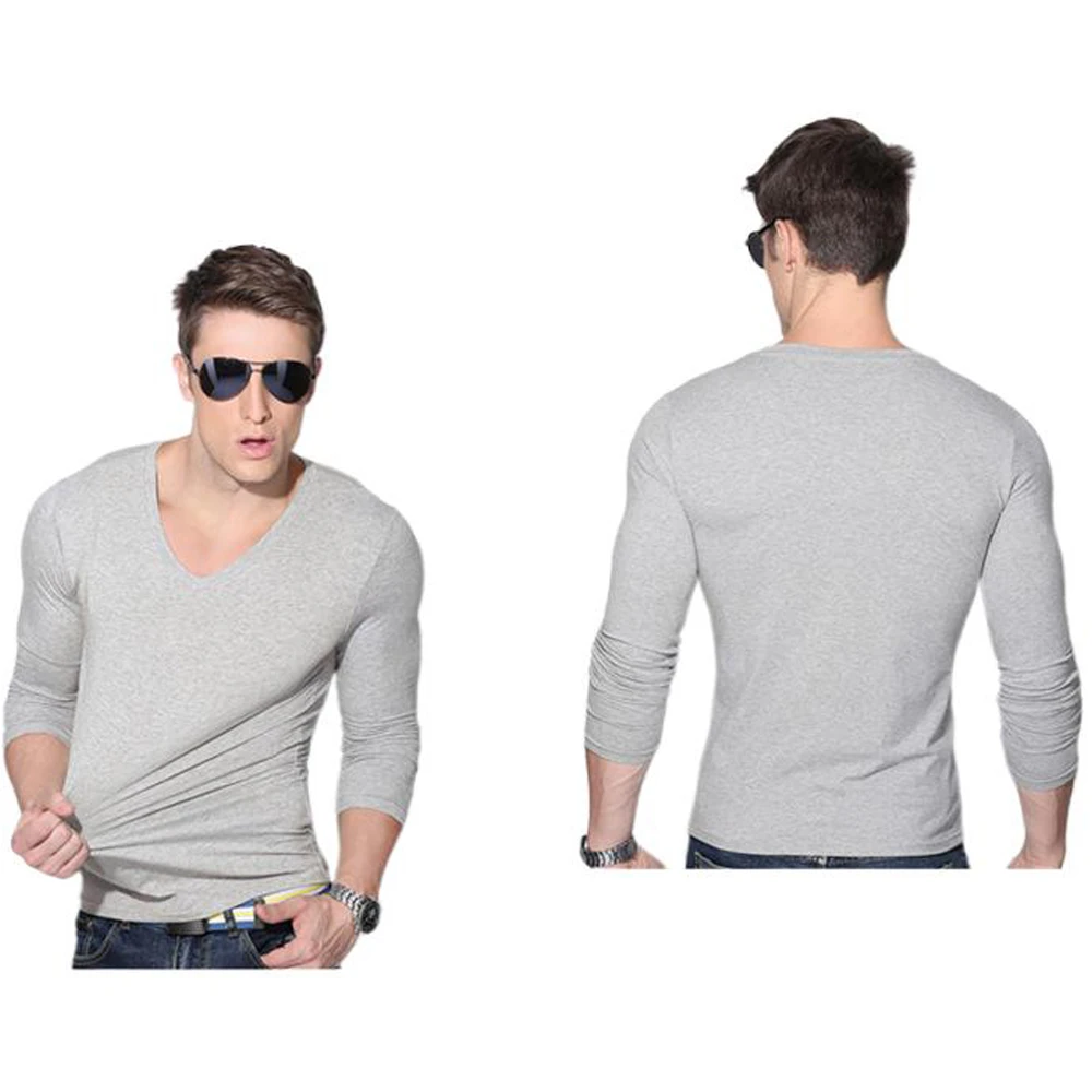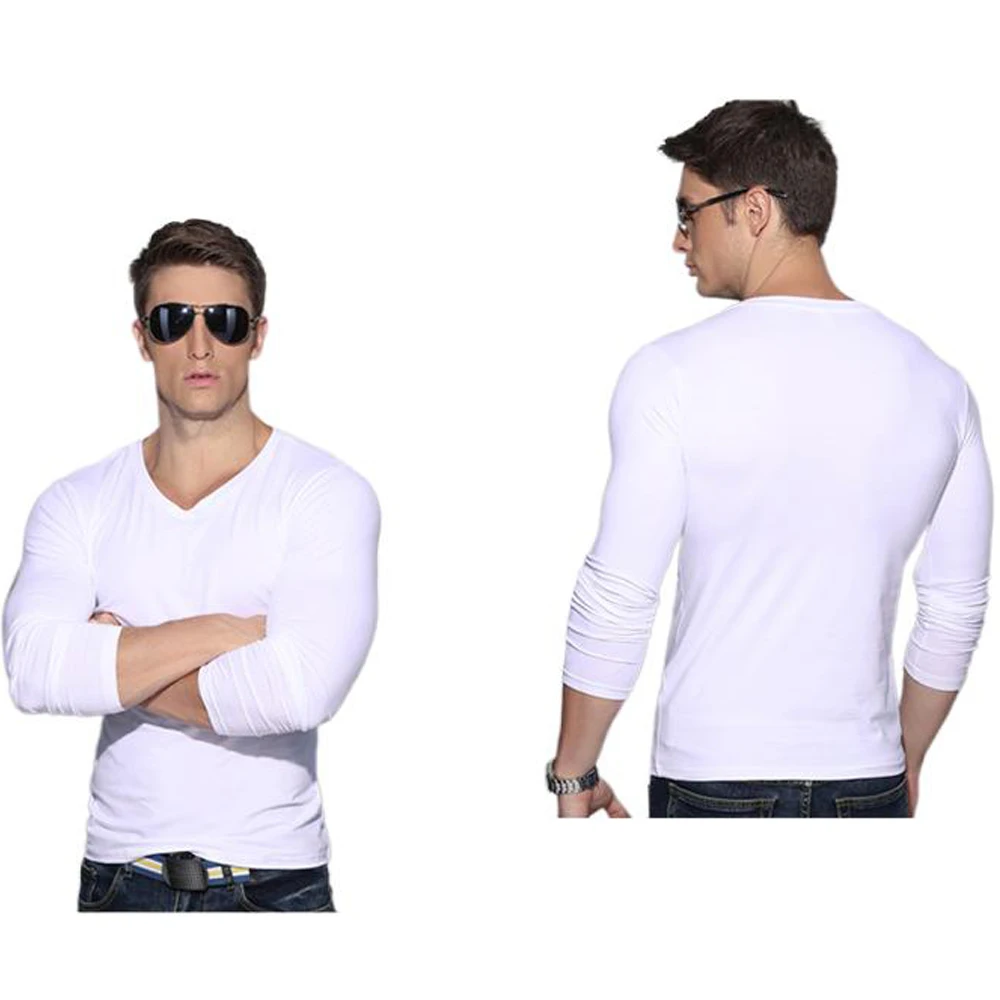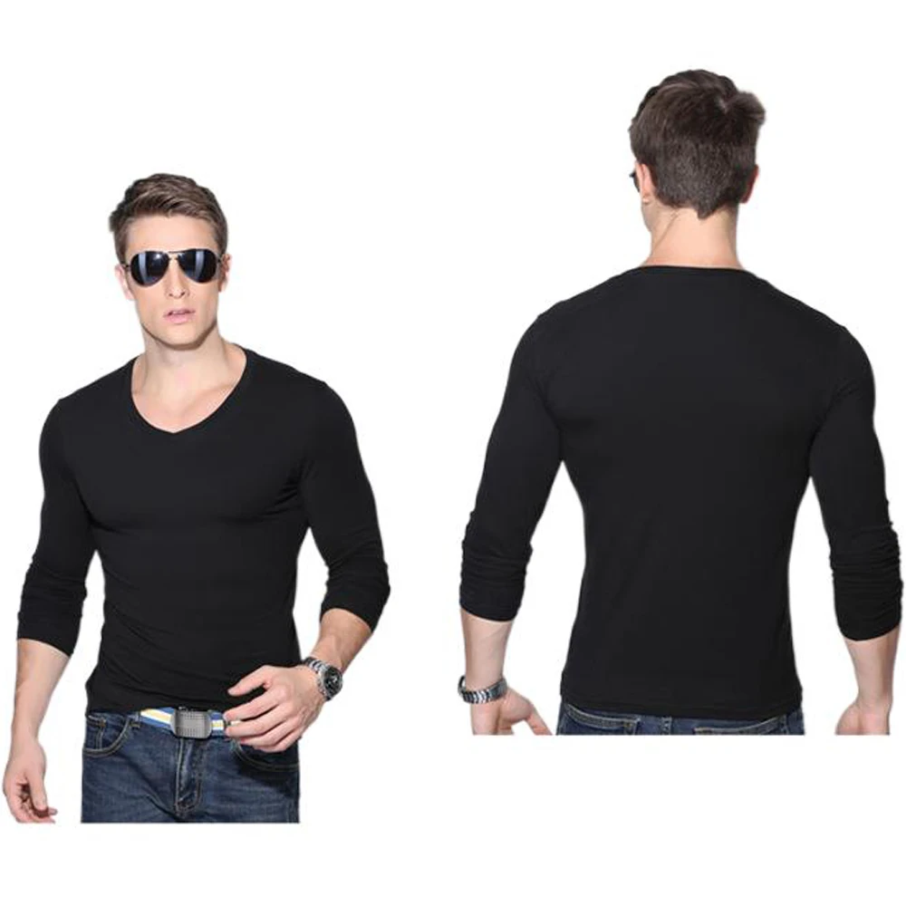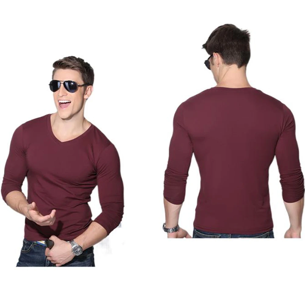 Один раз 2021 лайкра Slim Fit Мужская футболка с длинным рукавом вырез лодочкой v-образным вырезом Чистый цвет повседневные спортивные мышцы тройники размера плюс простые футболки