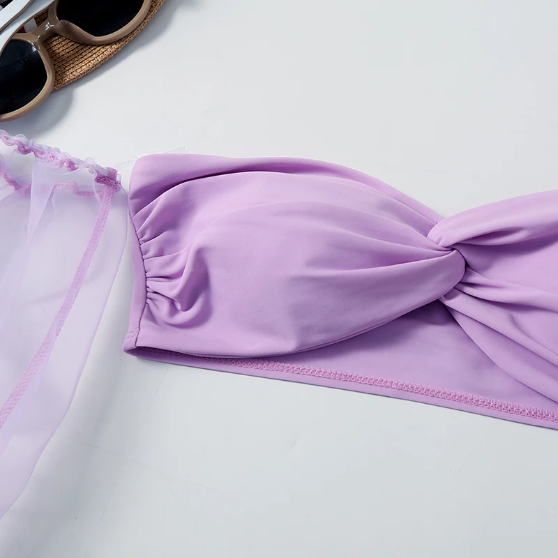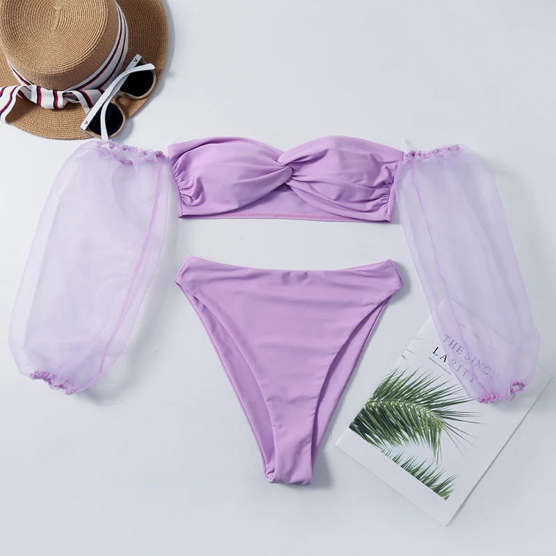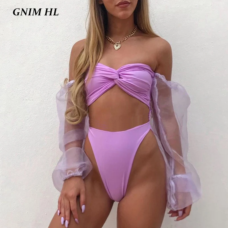Купальник GNIM женский с высокой талией, Бразильский бикини с чашками пуш-ап, шифоновый бикини с пышными длинными рукавами, пикантный купальный костюм, 2019