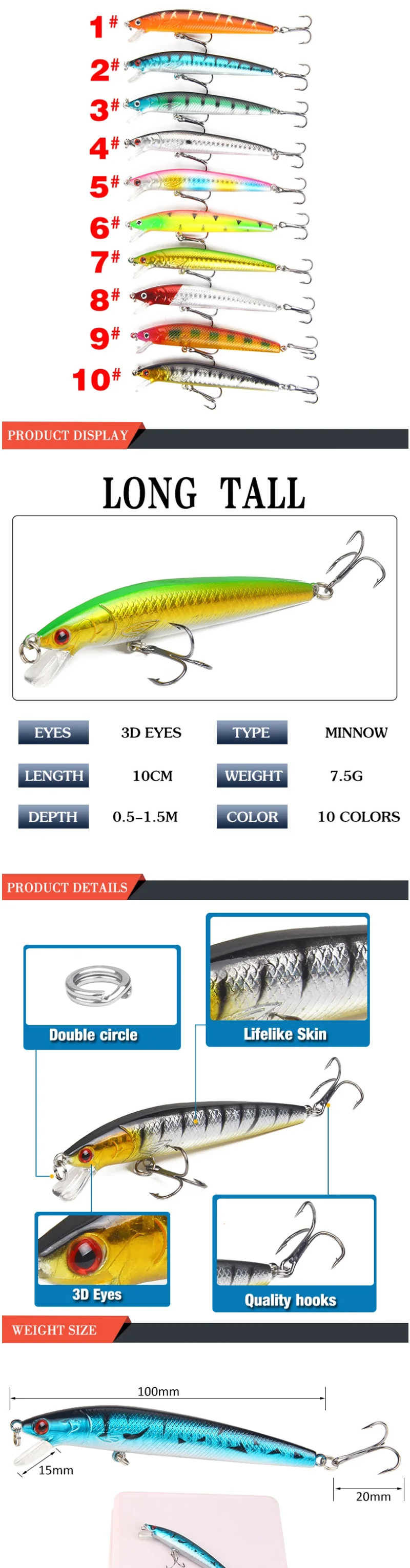 1, тело приманки принимает передовые материалы для защиты окружающей среды, не только имеет высокую ударную прочность, но и не производит вредных веществ для окружающей среды.
