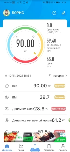 доставка супер быстрая. весы мне нравятся, легкие, изящные. уже неделю пользуюсь. приложение установилось нормально, меряет, контролирую вес каждый день. но по их данным я че то староват. а вот жена в норме.