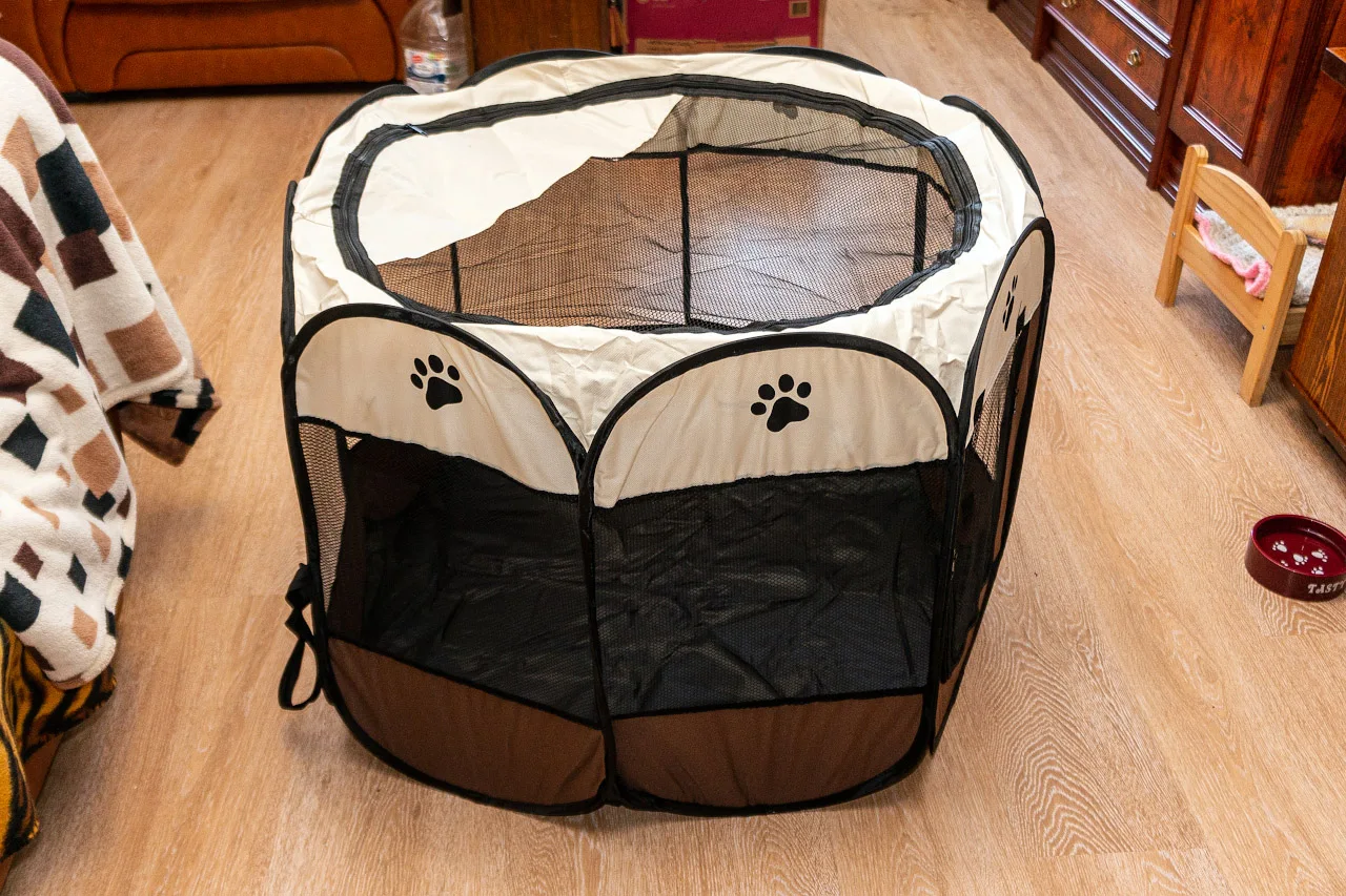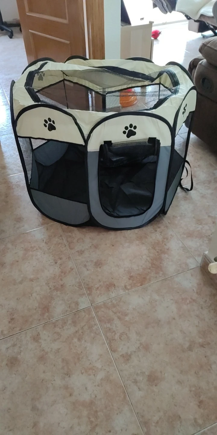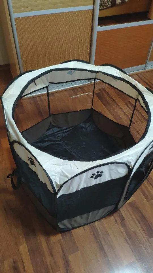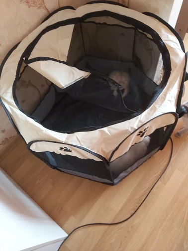 Это произошло очень быстро. Это как описано. Это портативный трафарет, который легко складывается, подходит для домашних животных, не очень больших, кажется практичным