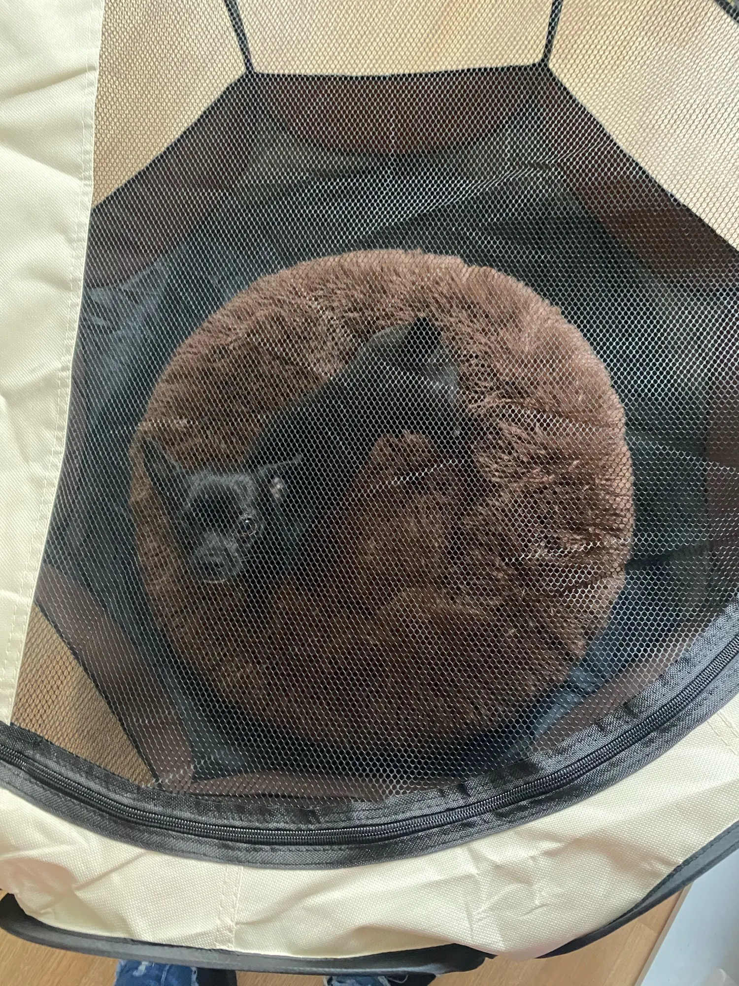 El producto llegó dañado por la parte de la cremallera,tuve que coserlo para que mi perro pudiera estar dentro los primeros dias pero desafortunadamente se terminó rompiendo, la calidad no es buena también tenia hilos sueltos de mal remate