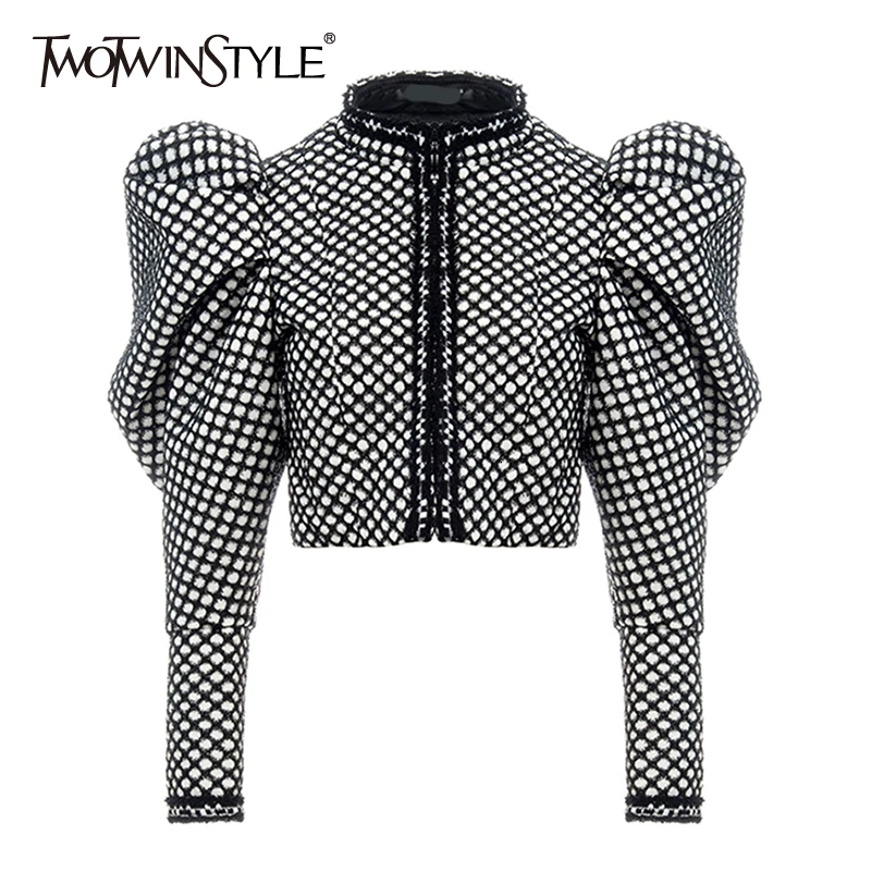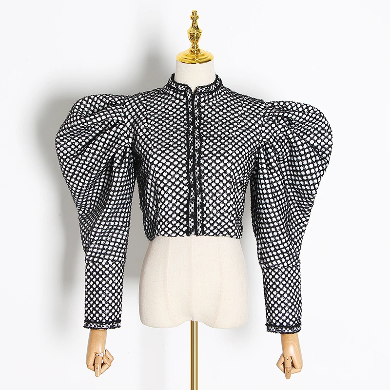 Пальто женское клетчатое с рюшами, круглым вырезом и пышными рукавами, на осень, 2020
