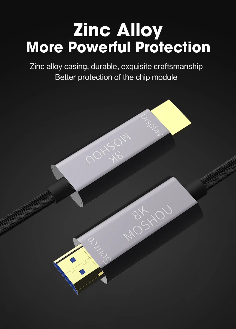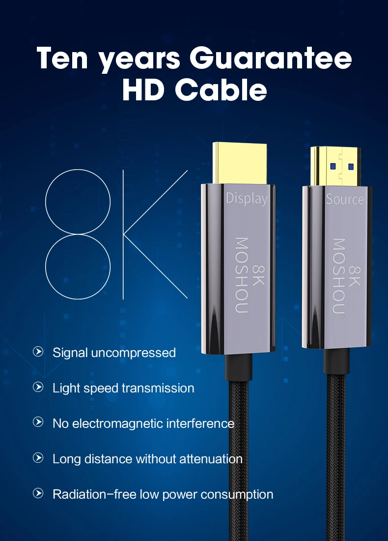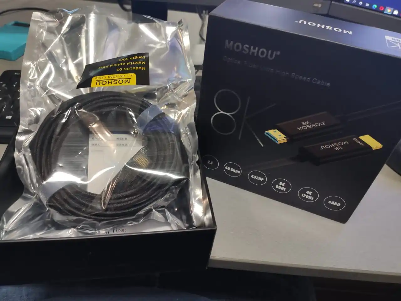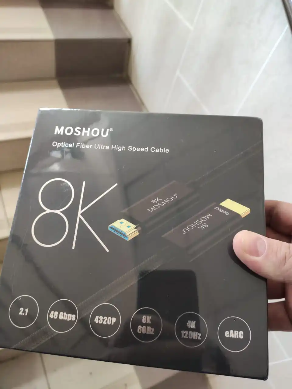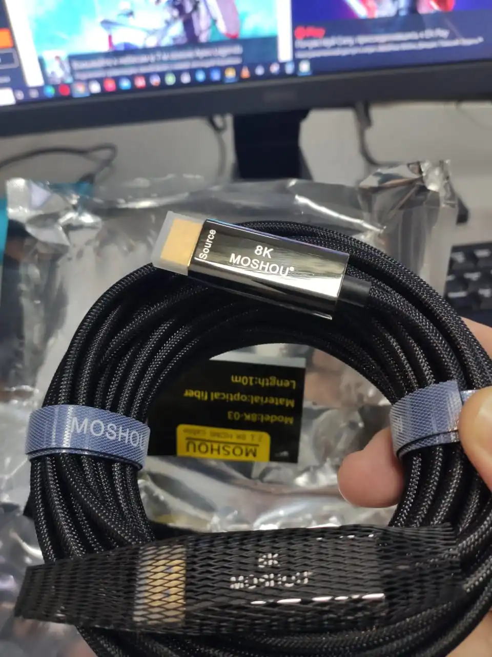 Высококачественный волоконно-оптический кабель Moshou 8K HDMI 2,1 очень хорошего качества. Легкий, достаточно гибкий, отлично работает. Вилки в сплошном сборе. Кабель был хорошо упакован. Изделие соответствует описанию. Точная обработка заказа и быстрая доставка. Я регулярно получаю кабели Moshou. Я уверенно рекомендую этого продавца и его продукцию.