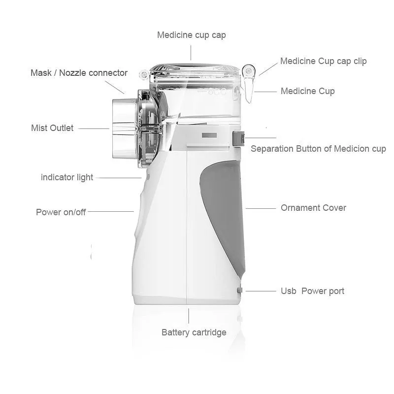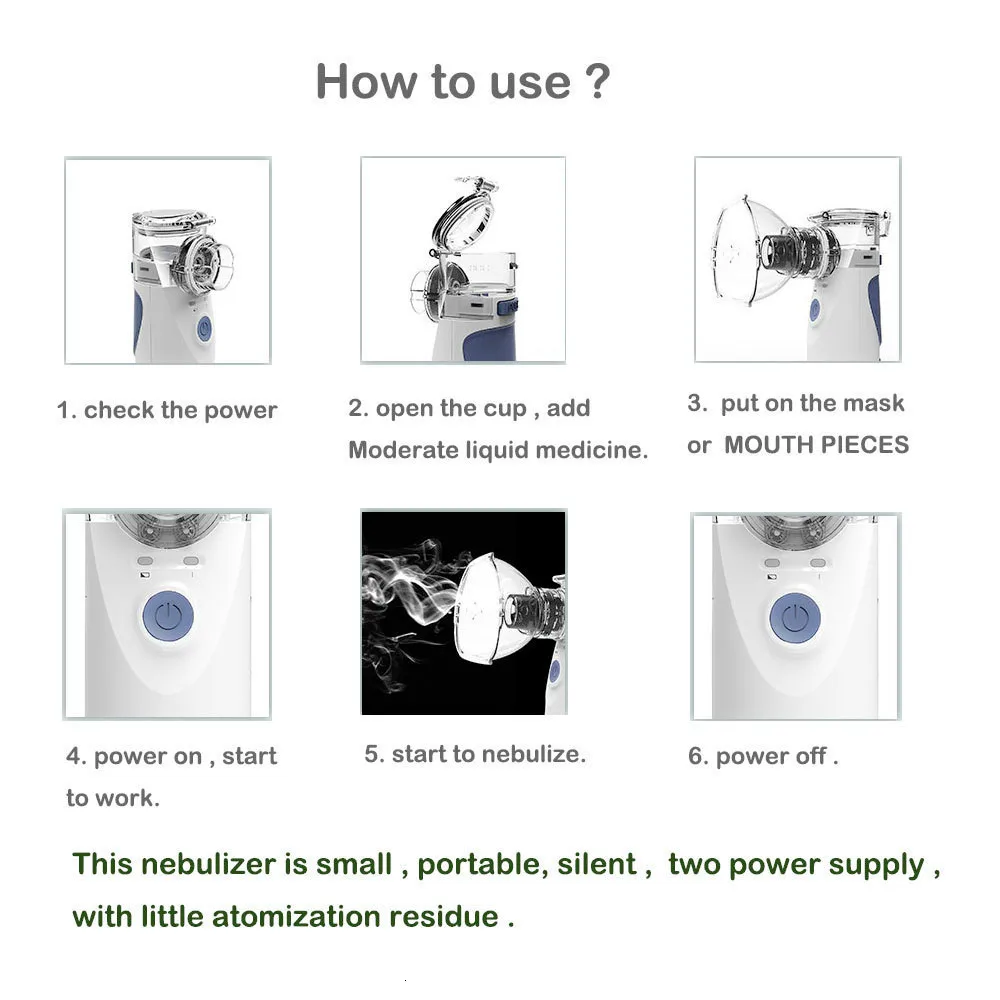 Для использования:1) Вставьте 2 батарейки AA (стандартные или перезаряжаемые) или подключите к usb-питаниюИсточник.2) Откройте чашку и добавьте жидкое лекарство.3) Прикрепите маску или мундштук.4) Нажмите кнопку питания, чтобы включить.5) Используйте небулайзер.6) Нажмите кнопку питания, чтобы выключить.Вы должны использовать разъем, который мы отправили вам; Другие вилки не будут работать.В первый раз, когда вы используете продукт, мы рекомендуем вам налить немного горячейВода (20-60 °C/70-140 °F). Сама машина не имеет функции нагрева.Техническое обслуживание:Снимите чашку и используйте теплую воду, чтобы очистить ее несколько раз, а затем протрите ее (промыть отдельно недостаточно). Не прикасайтесь к распылителю форсунки.Не используйте чистую воду, она не проводящая, вы можете использовать водопроводную воду.