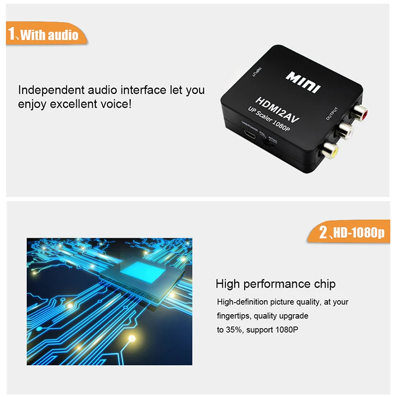 Мини-hdmi в AV преобразователь сигнала, который преобразует hdmi видео сигнал или аудио сигнал в AV (CVBS) композитный видео сигнал и FL/FR стерео аудио сигналы, в то время как Поддержка DVI системы sideline сигналы. Чтобы помочь пользователям изменить Высокое качество HDMI .. Видеосигнал в обычный CVBS сигнал (стандартное разрешение 480i, 576i,), так что можно воспроизводить на ТВ, VHS видеомагнитофон, DVD рекордеры, И т. Д. Также поддерживает NTSC и PAL два ТВ-формата, как показано ниже.