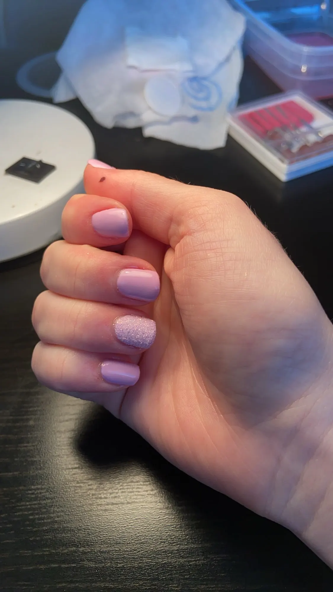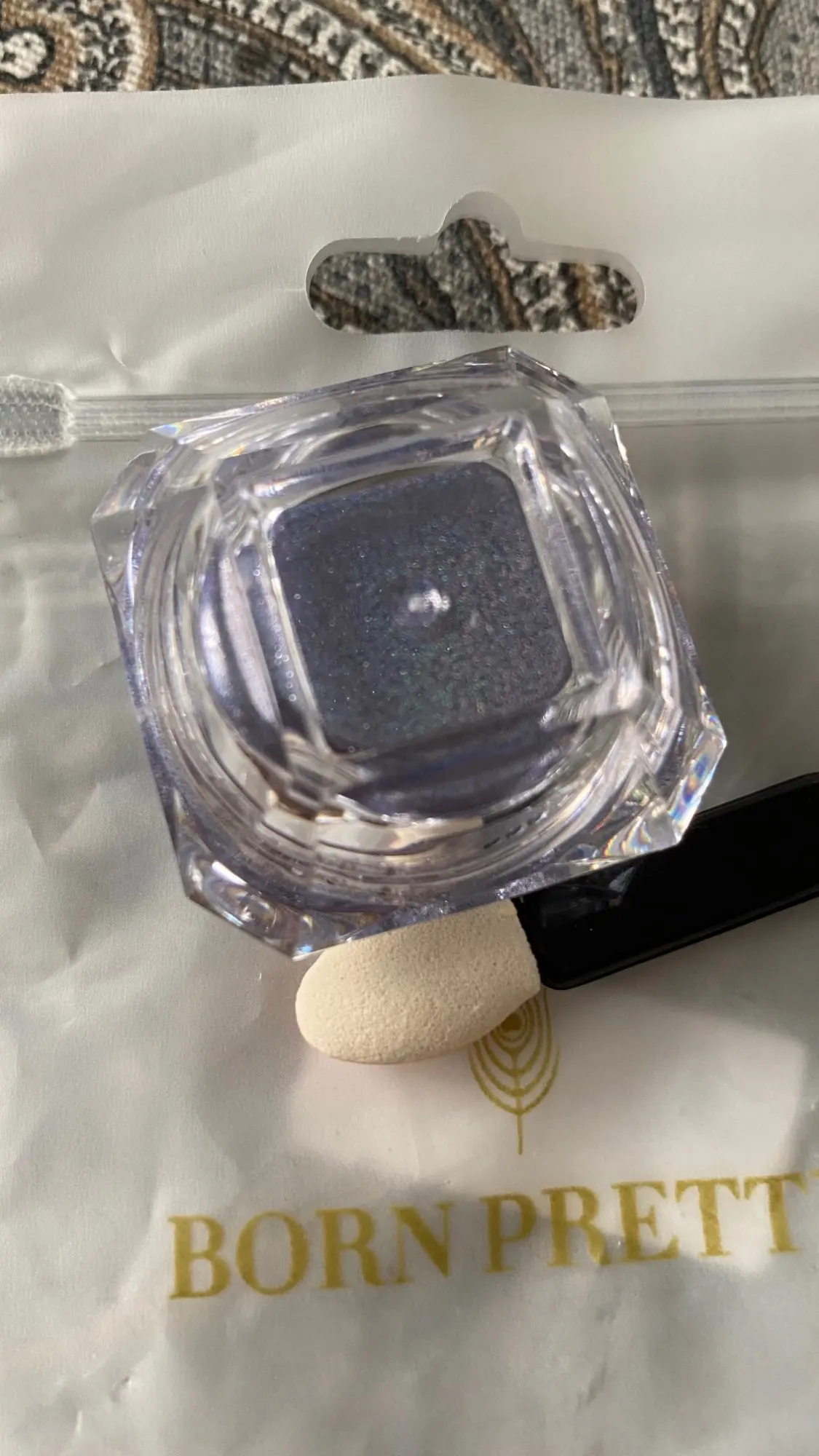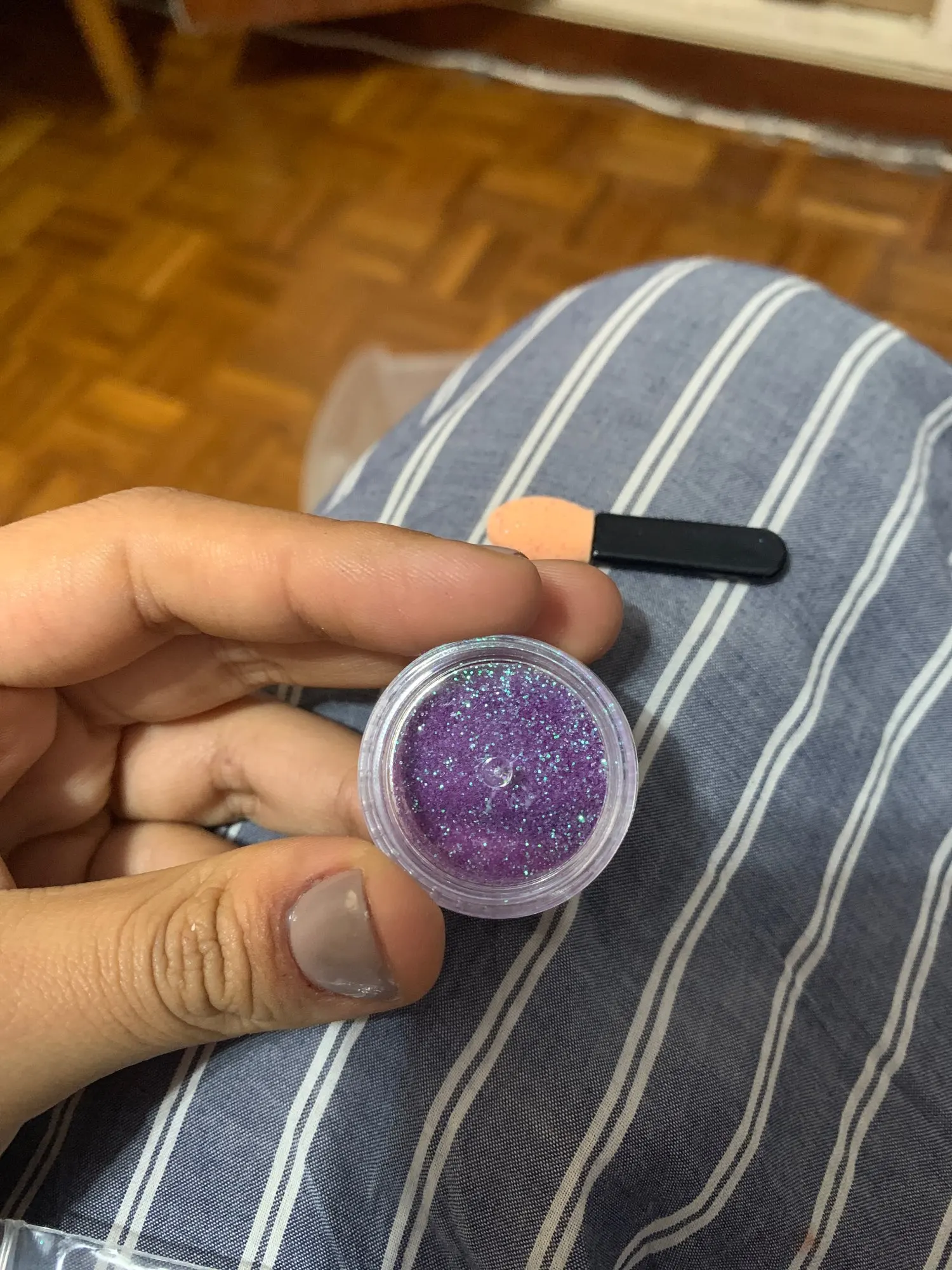 Баночка, большая, порадовало. Блестки красивые, думаю, что их нужно перекрывать топом, так как от щетки участками отпадают. Учитывая, что заказывала 11 ноября, посылка пришла очень быстро, чуть больше 2х недель. за это большое спасибо.