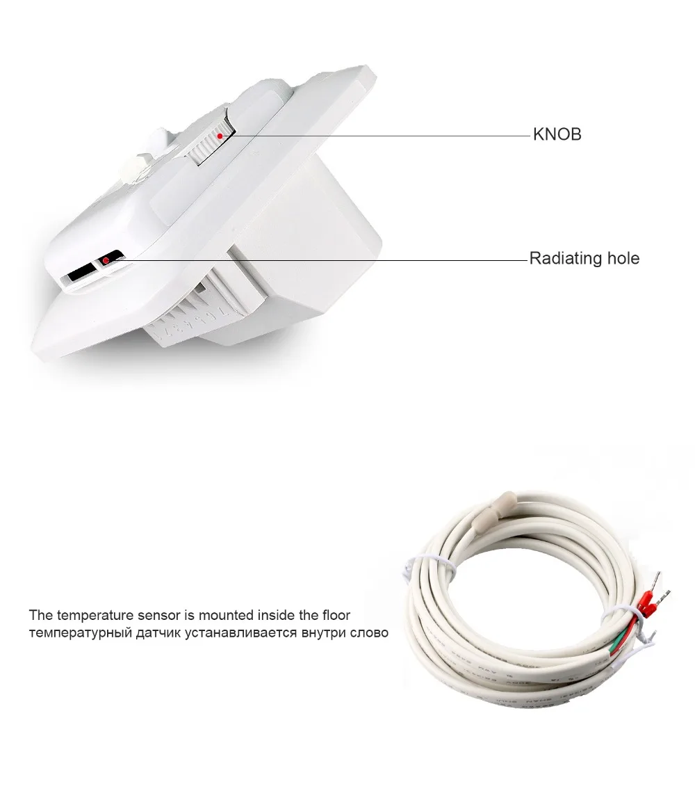 Термостат получает комнатную температуру через датчик пола, и нагревательный контакт закроется, когда комнатная температура поднимается выше заданной точки, и наоборот.