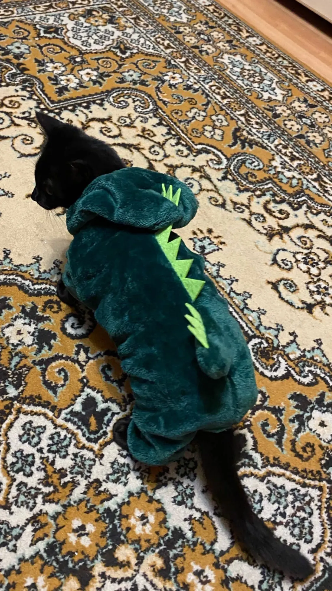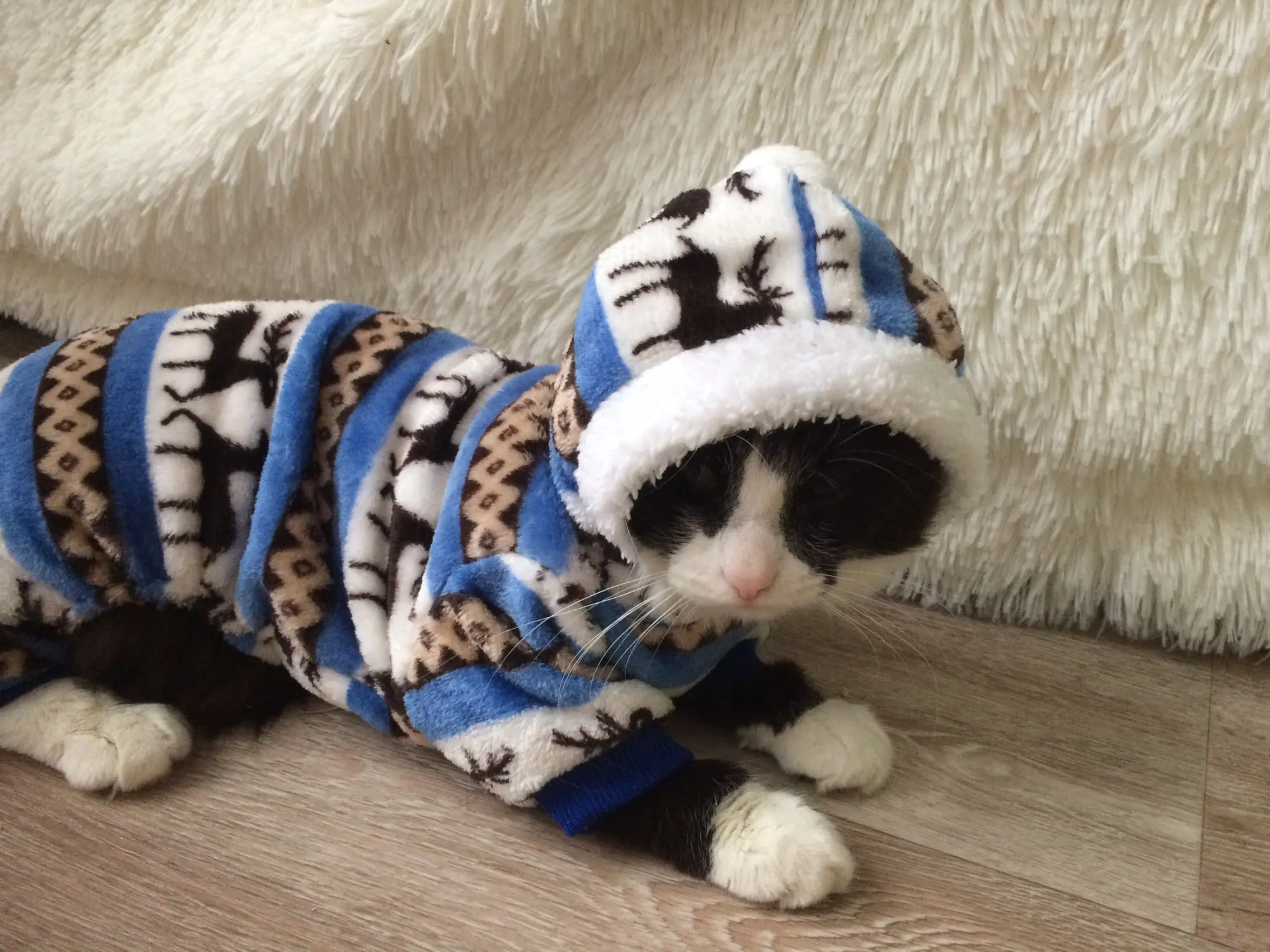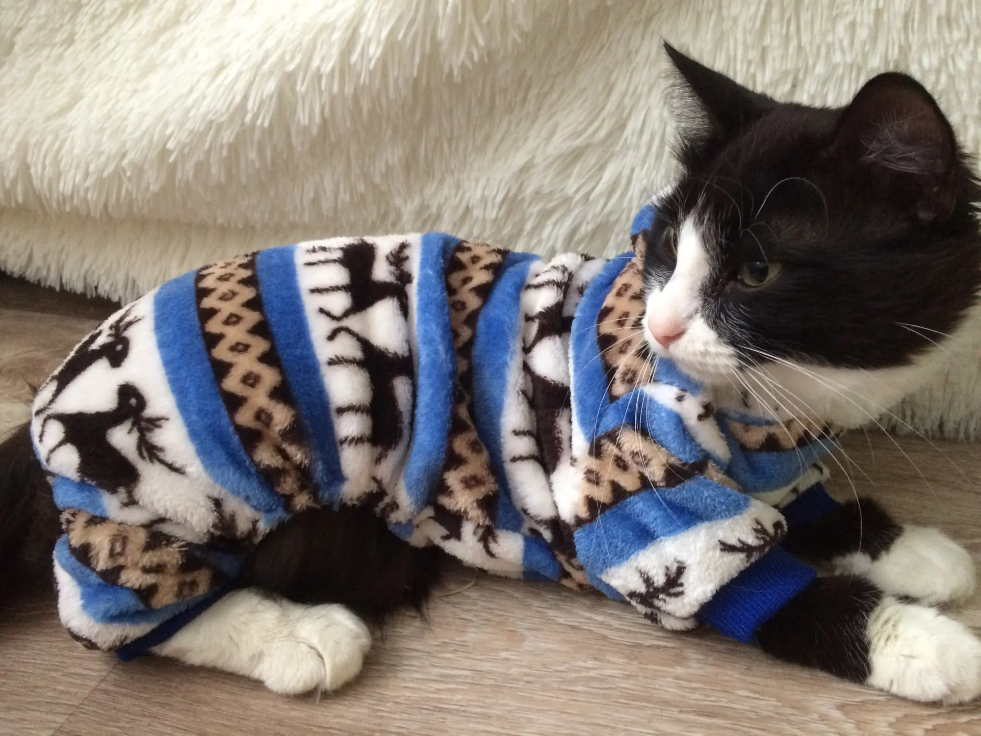 очень милый плюшевый костюмчик) коту не особо нравится, так как не привык, но он тёплый, что для моего кота идеально (очень сильно зависит от погоды и мёрзнет, потому и заказала). до Москвы дошло за пол месяца примерно. Заказом довольна) кот не очень