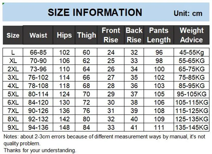 Размер ноги брюк 8XL очень маленький каучук и пресс. Пригласила масштаб, и он маленький. Рекомендуем заказывать на один размер больше.