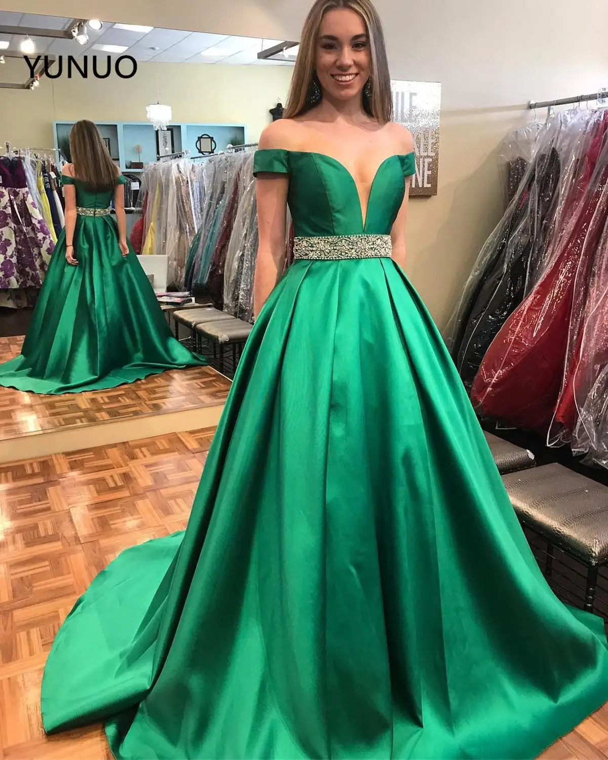 Атласные вечерние платья YUNUO с открытыми плечами, длинное платье для выпускного вечера, вечерние платья, платье на молнии с хрустальным поясом