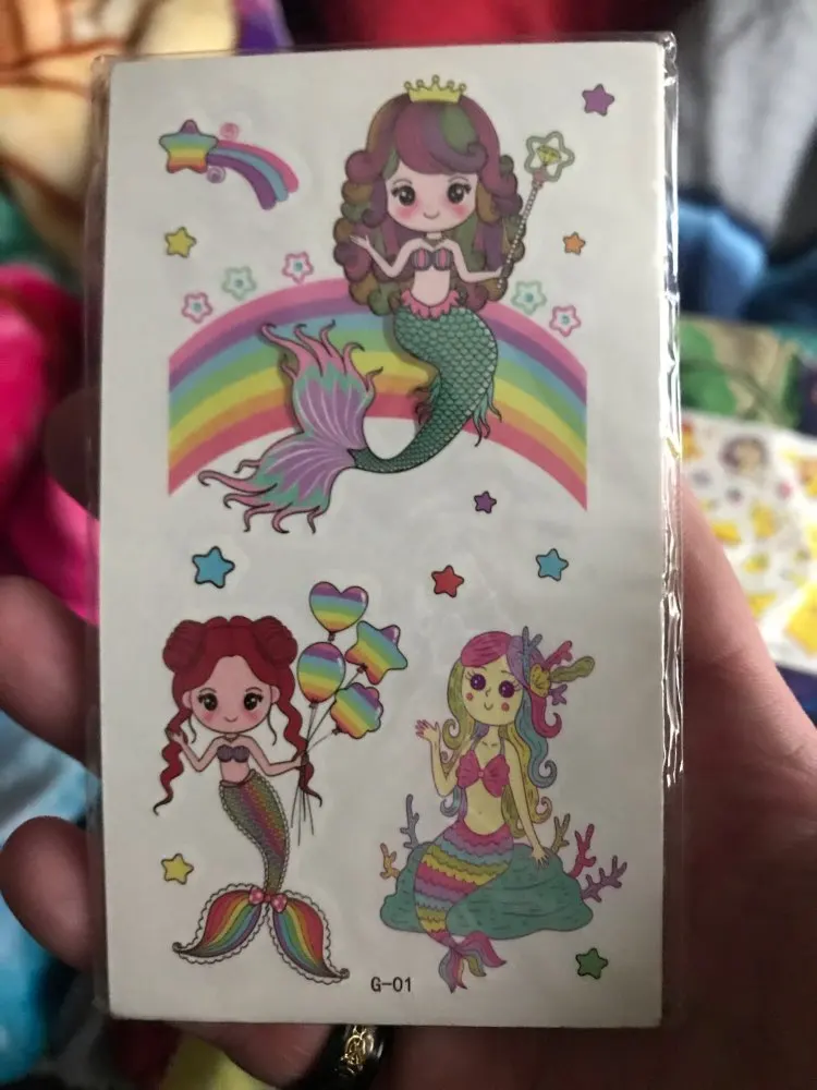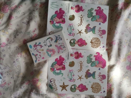 Эти татуировки идеально подходят для девочек, они очень красочные и разнообразные Они очень прочные и легко помещаются Дочке понравилось.