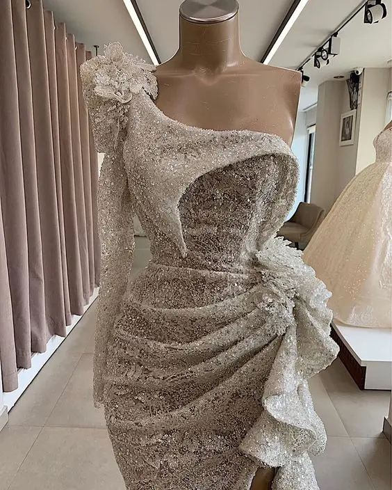 Женское вечернее платье с юбкой годе, кружевное платье с блестками и длинным рукавом, с одним открытым плечом, с высоким разрезом и оборками, шикарное платье для вечерние пускного вечера, 2020