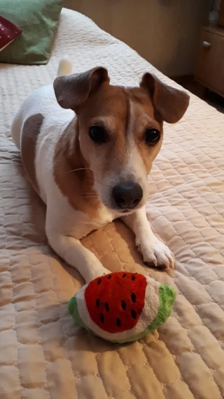Игрушка хорошего качества, без запаха, пищит, шкорка шуршит. Заказ пришёл быстро, дней 10 до Москвы. Собаке понравилась, больше за счёт шуршащтх листиков.