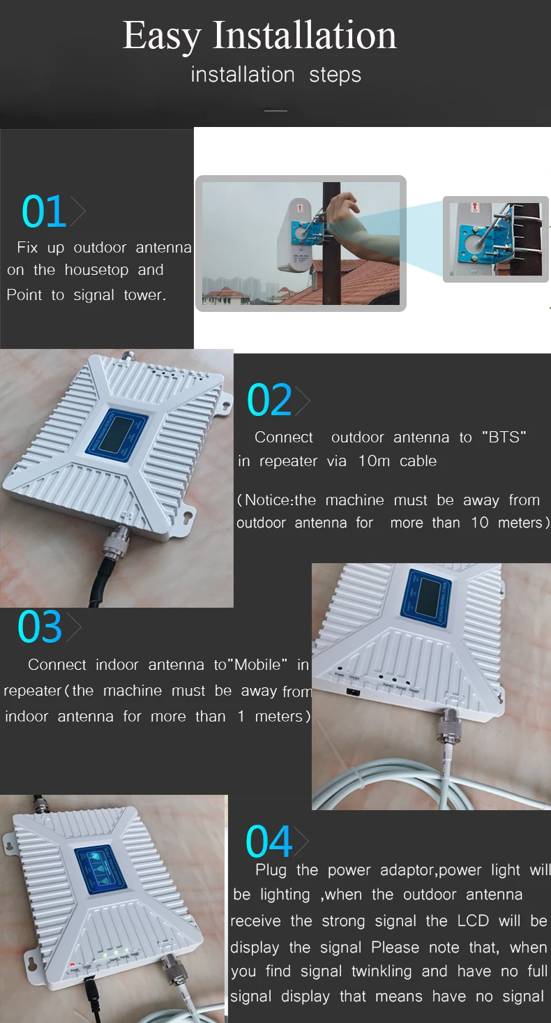 Этот усилитель подходит для диапазона частот GSM 900 МГц WCDMA2100mhz LTE2600mhz. Он может увеличить 2G 3G голосовые 4G данные. Если ваш 4G сигнал LTE2600 (полоса FDD 7), то этот ретранслятор также может увеличить данные 4g для вас. Перед покупкой убедитесь, что вы можете получить по крайней мере 2 бара 900 МГц (полоса 8)2100 МГц (полоса 1)LTE2600 (полоса FDD 7) сигнала наружного сигнала, В противном случае этот продукт не может вам помочь. Он нуждается в хорошем сигнале на открытом воздухе для улучшения сигнала в помещении.