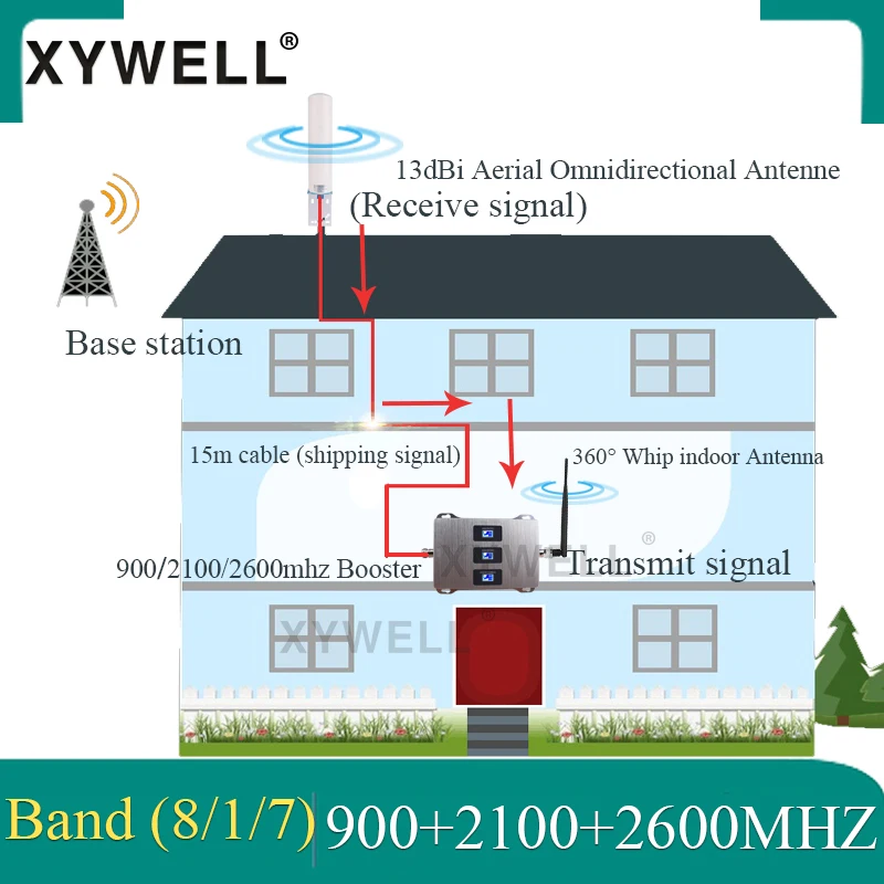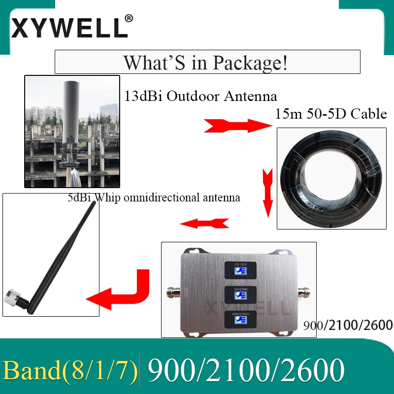 Усилитель сотового сигнала XYWELL 900/2100/2600 МГц, 2G 3G 4G, трехдиапазонный усилитель сигнала GSM 900 +(B1)WCDMA 2100 +(B7), повторитель сигнала сотового телефона FDD LTE 2600