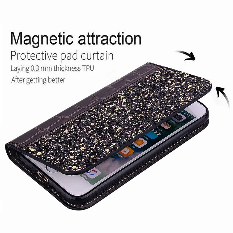 Кожаный чехол-книжка с блестками для iphone 11 Pro Max 12 mini X XR XS Max 7 8 6 s 6 s Plus 5 5S SE 2020, защитный чехол-Бумажник для телефона