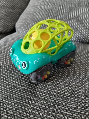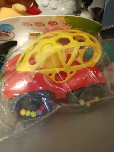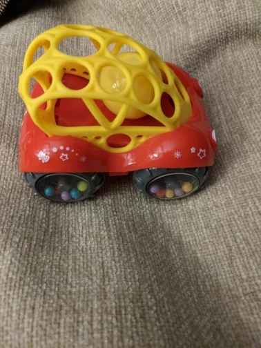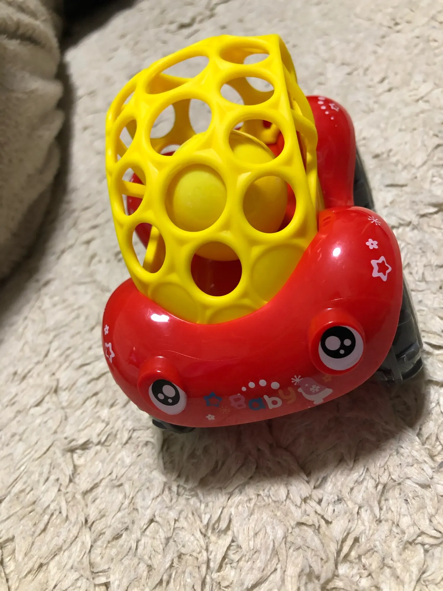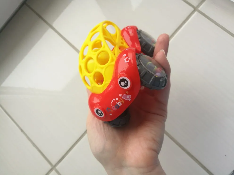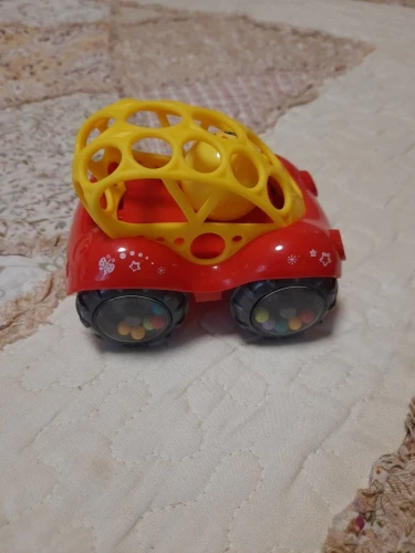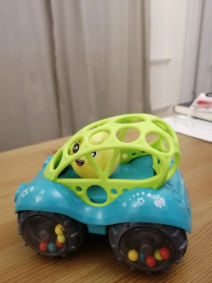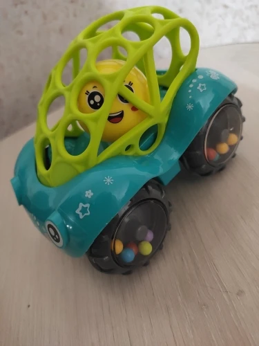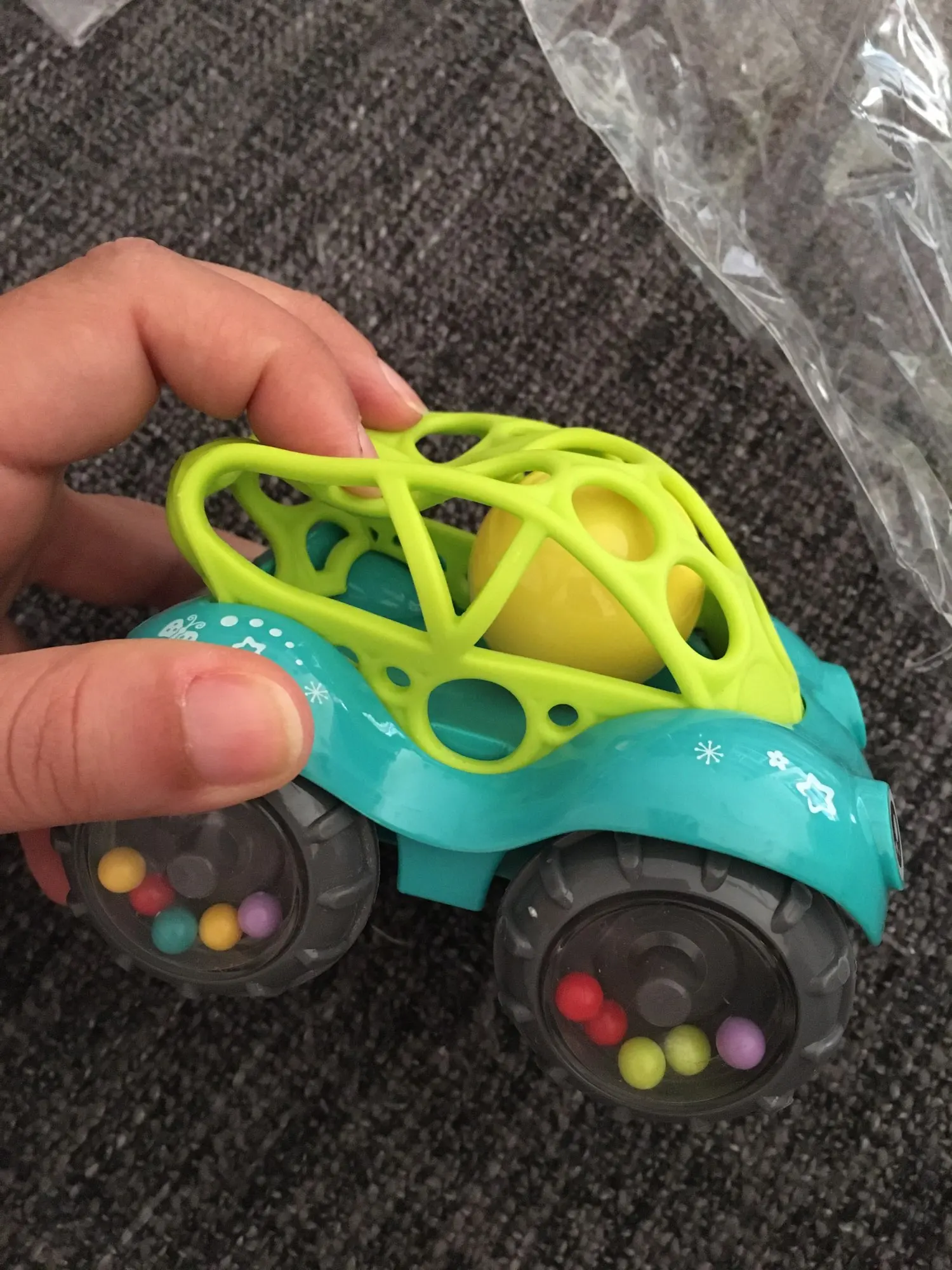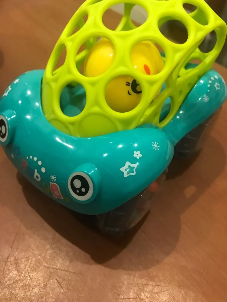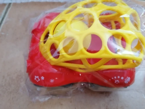 Машинка была упакована в 2 слоя пупырки, но мягкая крыша после пересылки все же выглядит несимметрично. Внутри крыши шарик с мелкими шариками, в колесах тоже мелкие шарики. Хорошая игрушка для маленького ребенка.