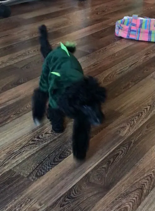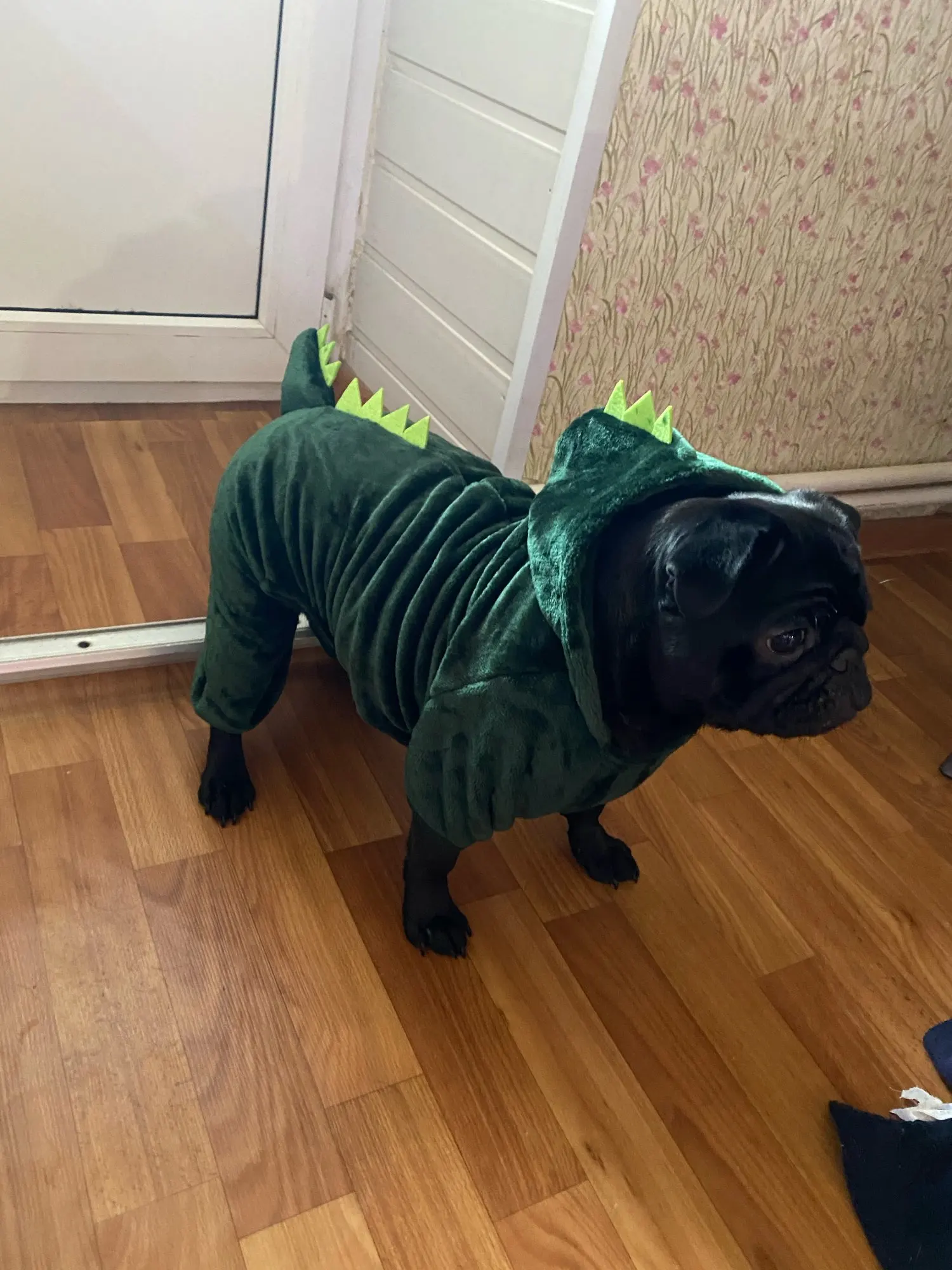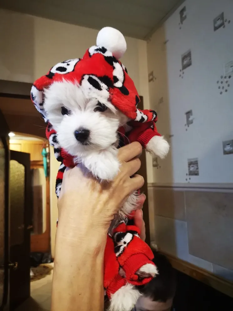 очень прикольный костюм. капюшон достаточно большой. на мальтезе сел идеально. правда небольшой минус,строчки ну очень кривые...