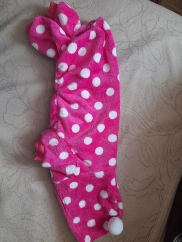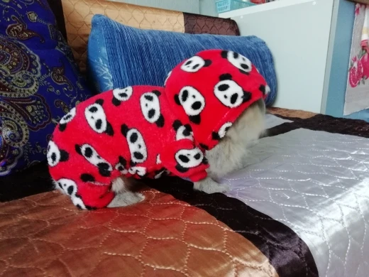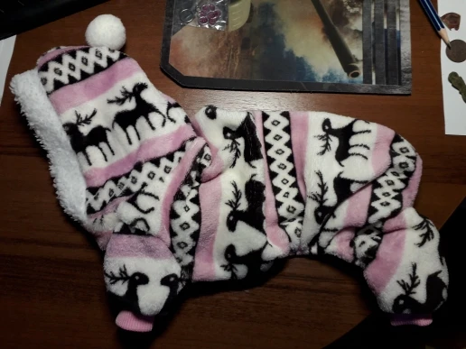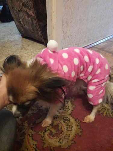 Очень теплая пижамка. Собаке нравится. Когда отопления еще не было, собаке было тепло. Немножко велика, но не критично. Спасибо продавцу.