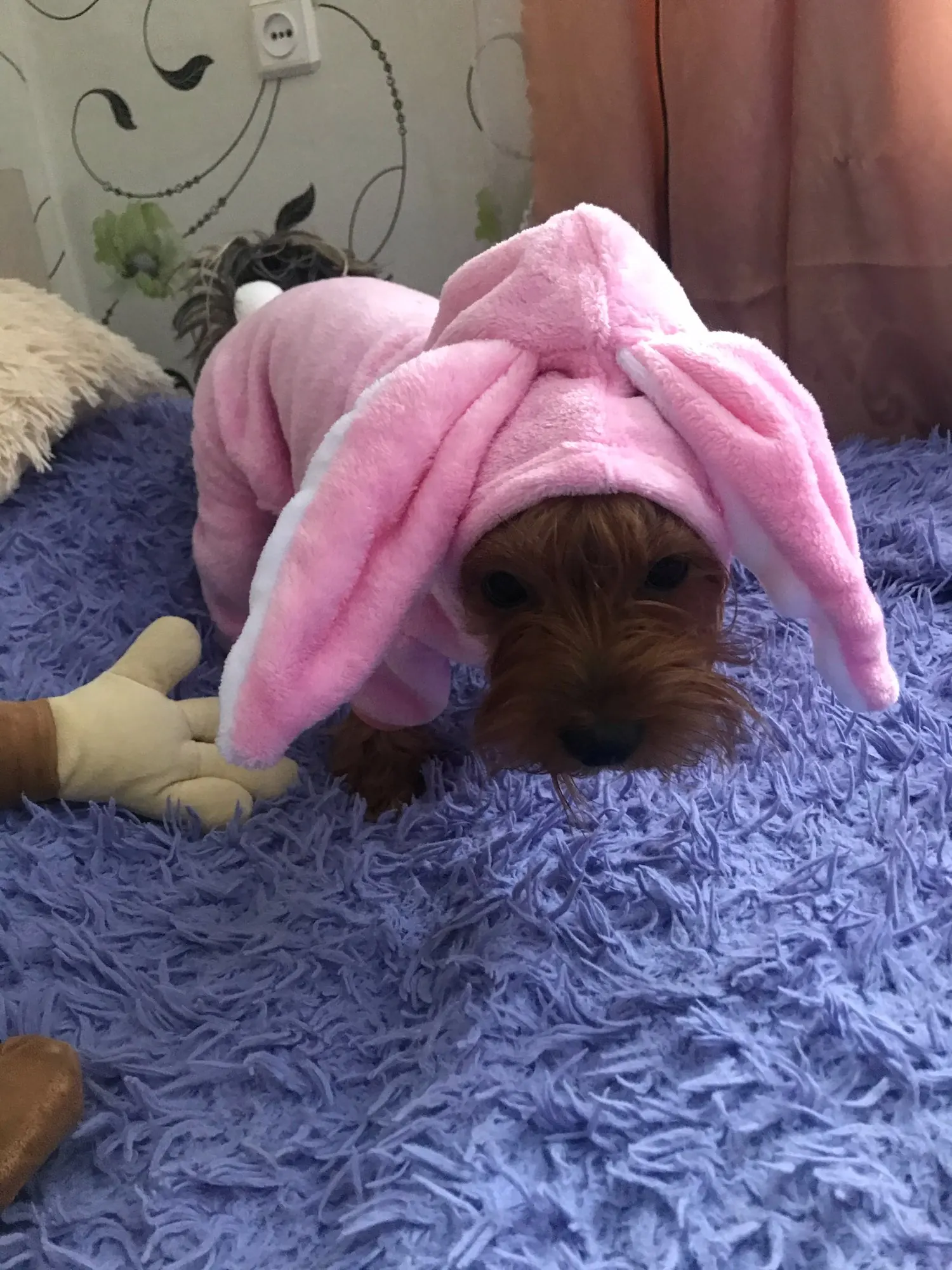Симпатичный комбез. По материалу нежный плюш, на животе кнопки, внутри флиса нет. В нижнюю часть вшита резинка, поэтому комбинезон не сползает и на задирается. На Йорка 3кг 26/36 взяла размер М. Сел идеально! До Москвы заказ дошёл на 3 недели.