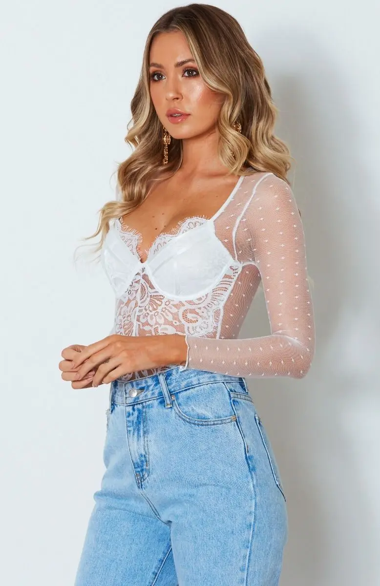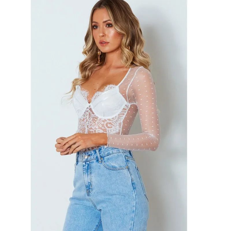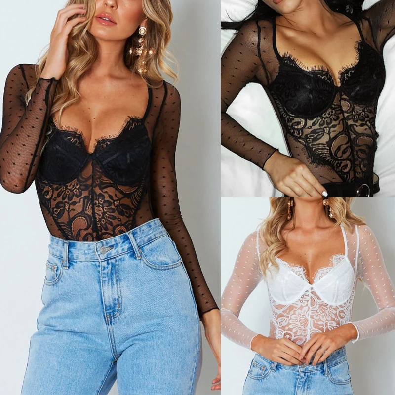 Сексуальное Женское боди, модный сетчатый прозрачный кружевной комбинезон с V-образным вырезом и длинным рукавом, комбинезон, тонкий прозрачный однотонный комбинезон