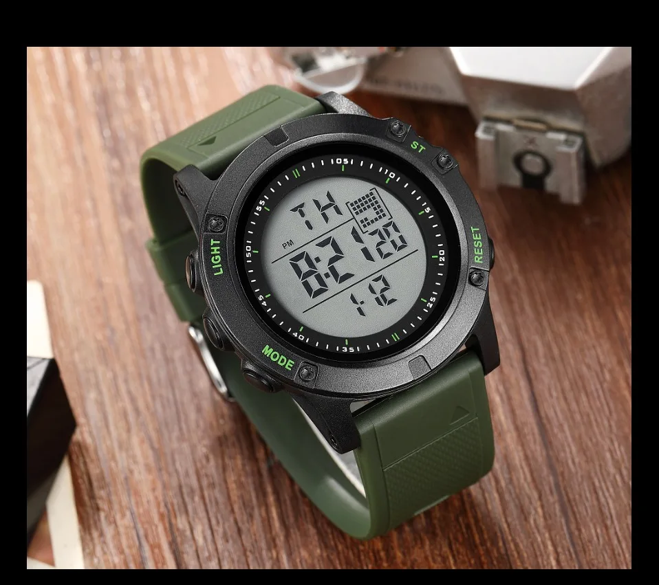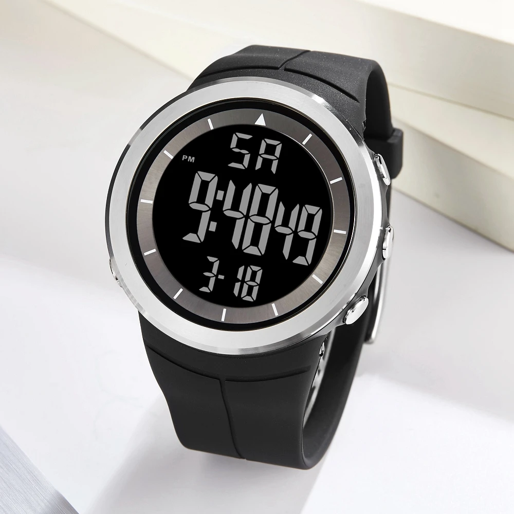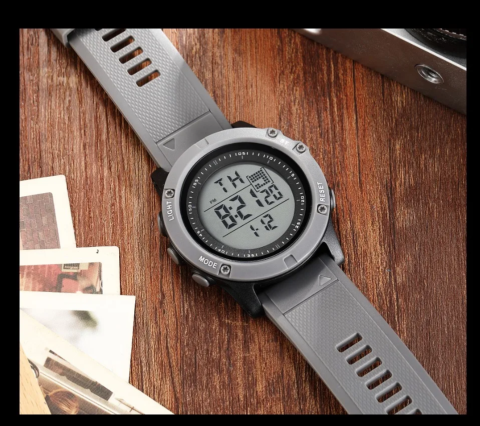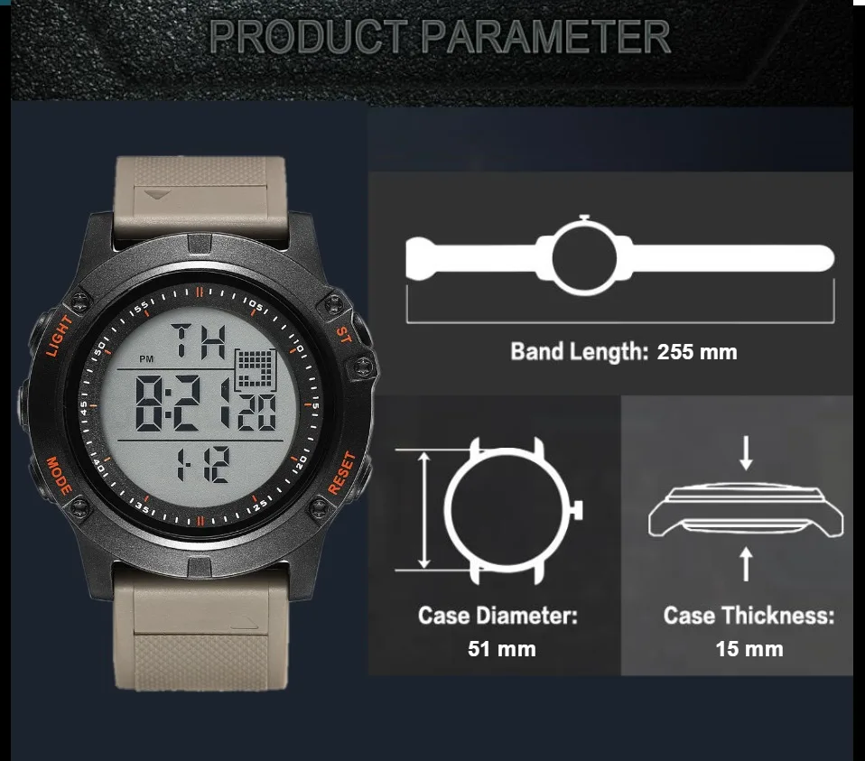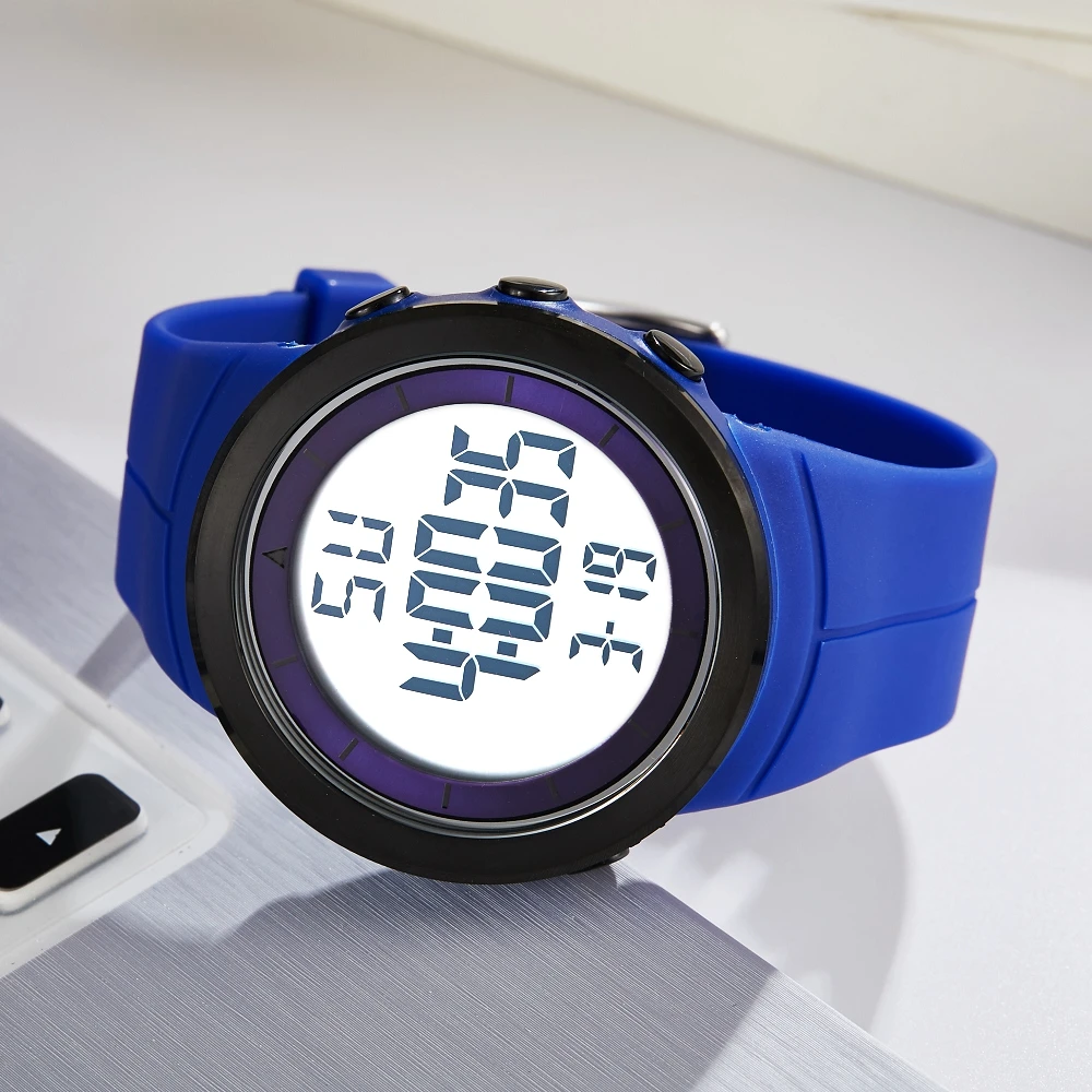 Цифровой: часы, минуты, секунды, pm, месяц, дата, день12/24 формата отображения времениФункция будильника и ежечасного звонкаСпециальный дизайн с хронографом (секундомером) с шагом 0,01 секундВодонепроницаемость до 30 м (не нажимайте кнопки в воде)Дополнительная функция подсветки ЖК-дисплея для четкого отображения времени в темнотеУдаропрочность, подходит как для наружных видов спорта, так и для внутренних видов спорта